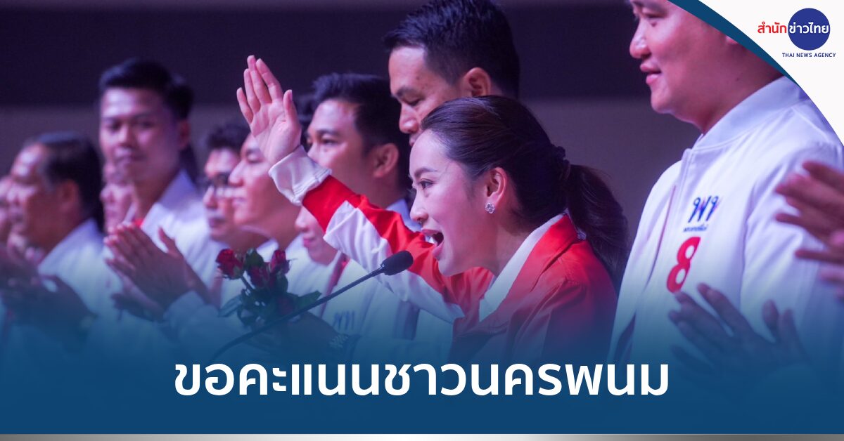 “วันนี้มาถึงพูดอะไรได้ไม่มาก โดนมองจับผิดว่า จะผิดกฎข้อนั้นข้อนี้ ตอนนี้นักร้องเสียงดีเยอะเหลือเกิน แต่เมื่อกี้ตอนเดินเข้ามามีชาวบ้านมากดไลก์ในโซเชียลให้ทุกวัน ขอบคุณที่เป็นกำลังใจให้ตน อยากได้กำลังใจจากพี่น้องชาวนครพนม ตนจะตั้งใจทำงานอย่างเต็มที่ในส่วนที่ได้รับ วันนี้มาหาเสียงพร้อมมาขอกำลังใจจากพี่น้องชาวนครพนม ยืนยันปีนี้เป็นปีแห่งโอกาสแน่นอน ขอให้ทุกคนเลือกเบอร์8 ขอให้สุขภาพแข็งแรงขอให้รวย รวย รวย ถ้วนหน้า” หัวหน้าพรรคเพื่อไทย ระบุ.-316-สำนักข่าวไทย