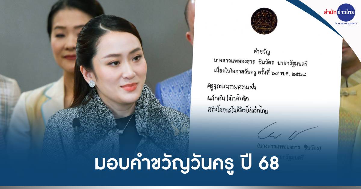 กรุงเทพฯ 13 ม.ค.-“แพทองธาร” นายกฯ มอบคำขวัญวันครู ปี 68 “ครูจุดประกายความฝัน ผลักดันให้กล้าคิด สร้างโอกาสในชีวิตให้เด็กไทย”