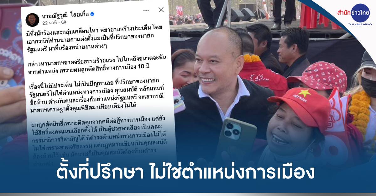 กรุงเทพฯ 14 ม.ค.-“ณัฐวุฒิ” แจงหลังมีนักร้อง-กลุ่มเคลื่อนไหว ยื่นสอบนายกฯ ขัดจริยธรรมร้ายแรง ยัน นายกฯ ตั้งเป็นที่ปรึกษา ไม่ใช่ตำแหน่งทางการเมืองเทียบเคียง “อดีตนายกฯ เศรษฐา” ตั้ง “พิชิต” ไม่ได้