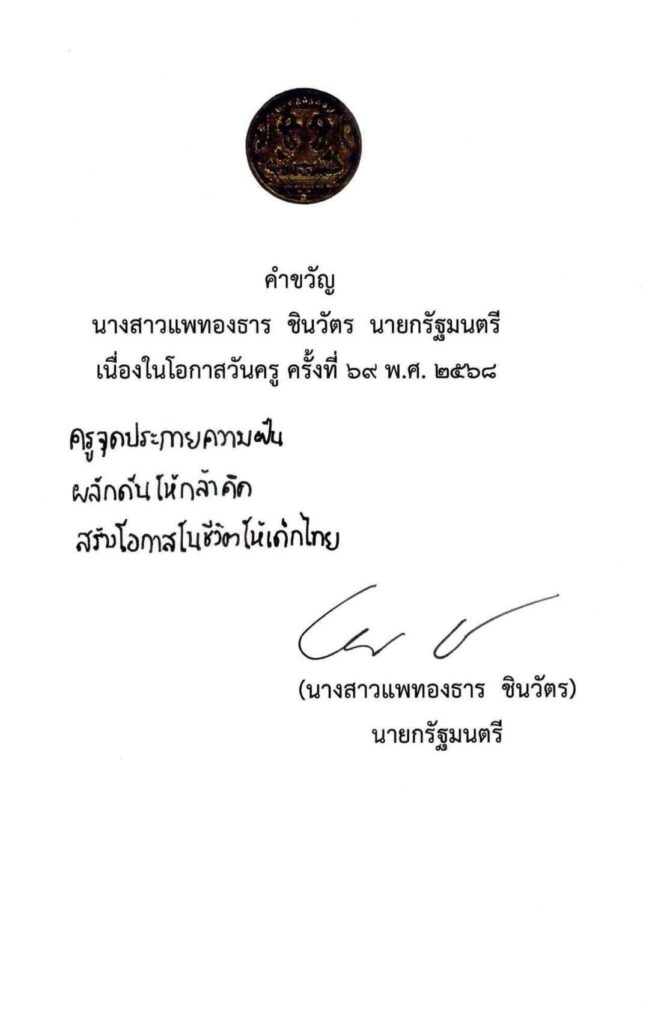 นางสาวแพทองธาร ชินวัตร นายกรัฐมนตรี โพสต์อวยพรวันครู 2568 ระบุว่า สวัสดีวันครู คำขวัญวันครูปีนี้ “ครูจุดประกายความฝัน ผลักดันให้กล้าคิด สร้างโอกาสในชีวิตให้เด็กไทย”