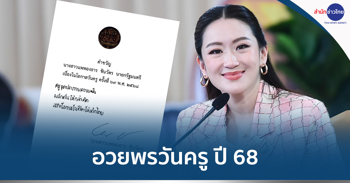 ทำเนียบ 16 ม.ค.- “นายกฯ อิ๊งค์” อวยพรวันครู ปี 68 ขอให้ครู-นักการศึกษา สุขภาพแข็งแรง สร้างแรงบันดาลใจ-โอกาส ให้อิสระเด็ก “กล้าคิด” เพื่อให้ “คิดเป็น”