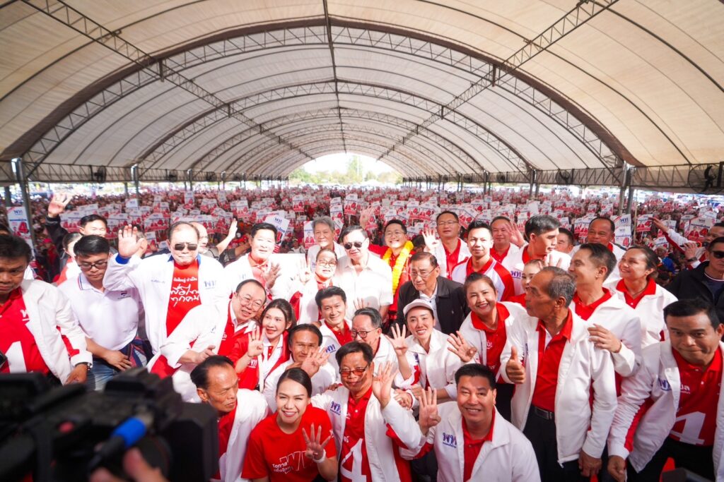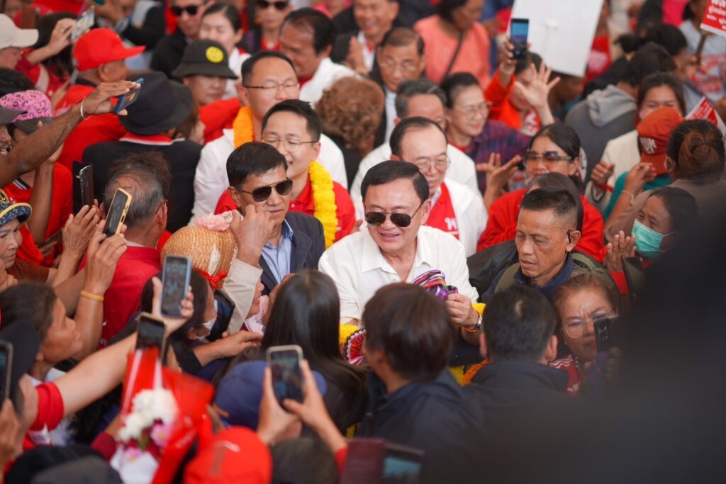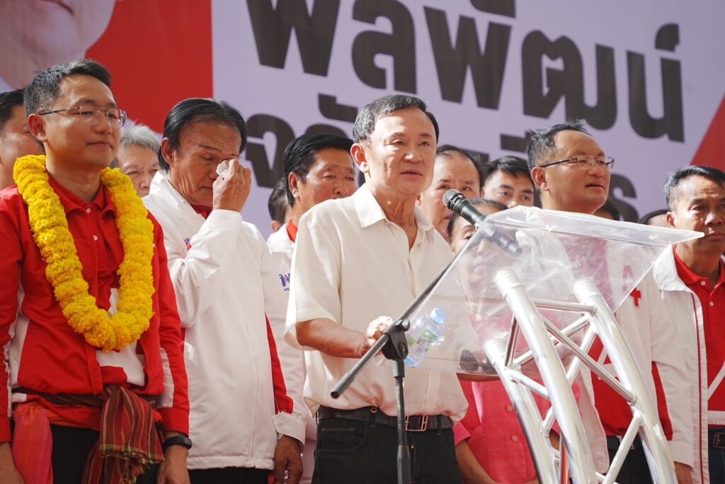 “พี่น้องครับอยากให้ผมกลับมาพยัคฆภูมิอีกไหม กลับมาแล้วเนี่ย ถ้าผู้สมัครได้เป็นนายก อบจ. ผมกลับมาเท่เลย แต่ถ้าผู้สมัครไม่ได้เป็นนายก อบจ. ทำไงล่ะ ต้องคุมปี๊บไหม พี่น้องจะยอมให้ผมคุมปี๊บหรือไม่ยอม ก็ขอให้เลือกเบอร์ผู้สมัครนะ ยังไงก็ถือว่าเราเป็นหุ้นส่วนพัฒนาประเทศด้วยกัน ให้ประเทศเจริญไปด้วยกัน เราเป็นหุ้นส่วนที่จะทำให้คนไทยอยู่ดีกินดีขึ้น เพราะฉะนั้นเราต้องเป็นทีมเดียวกัน ว่าไงว่าตามกัน ขอบคุณพี่น้องที่อุตส่าห์มาร้อนๆ ก็ยังอยู่กันเหนียวแน่น แล้วมาเจอกันใหม่ วันที่ผู้สมัครฯ เป็นนายก อบจ. พี่น้องที่อุตส่าห์มาร้อนๆ ก็ยังอยู่กันเหนียวแน่น เราขอโทษแทนคนเมื่อกี้ ไม่รู้ว่าเพราะอะไร ไม่เป็นไร ช่างมัน เสียบรรยากาศไปนิดหน่อย แต่ขอโทษแทนแล้วกัน” นายทักษิณ กล่าวทิ้งท้ายก่อนเดินทางกลับ