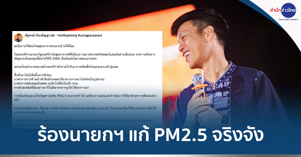 “การป้องกันและแก้ไขปัญหาฝุ่นพิษ PM2.5 สามารถทำได้ แต่ต้องวางแผนและดำเนินการให้ทุกฝ่ายทราบชัดเจนล่วงหน้า ก่อนการเดินทางหา ‘โอกาส’ จากต่างประเทศ คนไทยอยากขอเพียง ‘อากาศ’ ในประเทศที่จะให้เราทุกคนหายใจได้อย่างเต็มปอดในแต่ละวัน ขอเรียกร้องให้นายกรัฐมนตรีแพทองธาร ชินวัตร และคณะรัฐมนตรีของท่าน จริงจังกับการแก้ปัญหา โดยเฉพาะตัวนายกรัฐมนตรี เลิกลอยตัวเหนือปัญหาเสียทีครับ” นายณัฐพงษ์ ระบุ.-315 -สำนักข่าวไทย