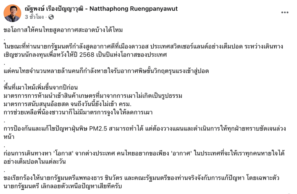 นายณัฐพงษ์ เรืองปัญญาวุฒิ หัวหน้าพรรคประชาชน โพสต์ข้อความผ่านเฟซบุ๊ก ถึงปัญหาฝุ่น PM 2.5 ระบุว่า ขอโอกาสให้คนไทยสูดอากาศสะอาดบ้างได้ไหม ในขณะที่ท่านนายกรัฐมนตรีกำลังสูดอากาศดีที่เมืองดาวอส ประเทศสวิตเซอร์แลนด์อย่างเต็มปอด ระหว่างเดินทางเชิญชวนนักลงทุน เพื่อหวังให้ปี 2568 เป็นปีแห่งโอกาสของประเทศ แต่คนไทยจำนวนหลายล้านคนก็กำลังหายใจรับอากาศพิษขั้นวิกฤติรุนแรงเข้าสู่ปอด พื้นที่เผาไหม้เพิ่มขึ้นจากปีก่อน มาตรการการห้ามนำเข้าสินค้าเกษตรที่มาจากการเผาไม่เกิดเป็นรูปธรรม มาตรการสนับสนุนอ้อยสด จนถึงวันนี้ยังไม่เข้า ครม. การช่วยเหลือพี่น้องชาวนาก็ไม่มีมาตรการจูงใจให้ลดการเผา