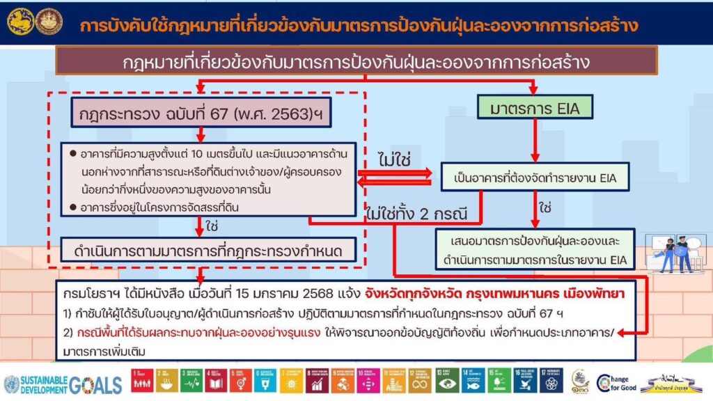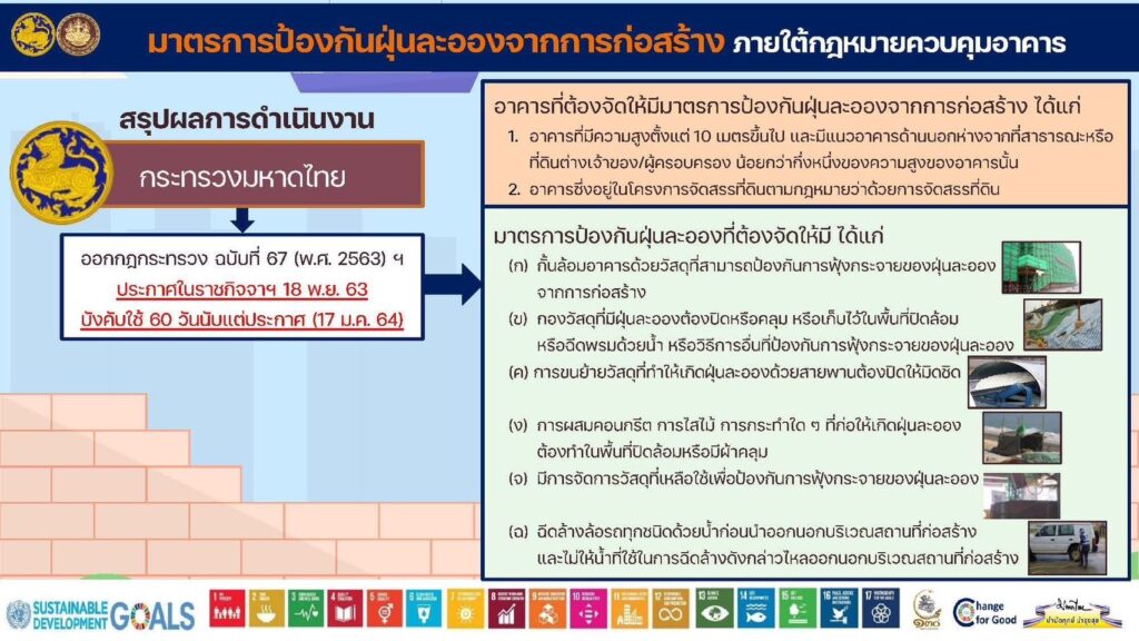 จากปัญหาเรื่องฝุ่นละอองที่เกิดขึ้นตามความเจริญของเมือง เนื่องด้วยมีการก่อสร้างต่าง ๆ มากมาย จนส่งผลกระทบกับชีวิตความเป็นอยู่ของประชาชน กรมโยธาธิการและผังเมือง ในฐานะหน่วยงานที่ดูแลเรื่องการออกกฎหมายควบคุมอาคาร จึงได้ออกกฎกระทรวง ฉบับที่ 67 (พ.ศ.2563) ออกตามความในพระราชบัญญัติควบคุมอาคาร พ.ศ. 2522 เพื่อเป็นหนึ่งในกฎหมายป้องกันฝุ่นที่เกี่ยวข้องกับการก่อสร้างอาคาร มีความครอบคลุมในเรื่องการฟุ้งกระจายของฝุ่นที่เกิดจากการก่อสร้างอาคาร ตลอดจนถึงรถที่ใช้ขนวัสดุในการก่อสร้างอาคาร โดยเนื้อหาของกฎหมายเรื่องของฝุ่นละอองมีดังนี้