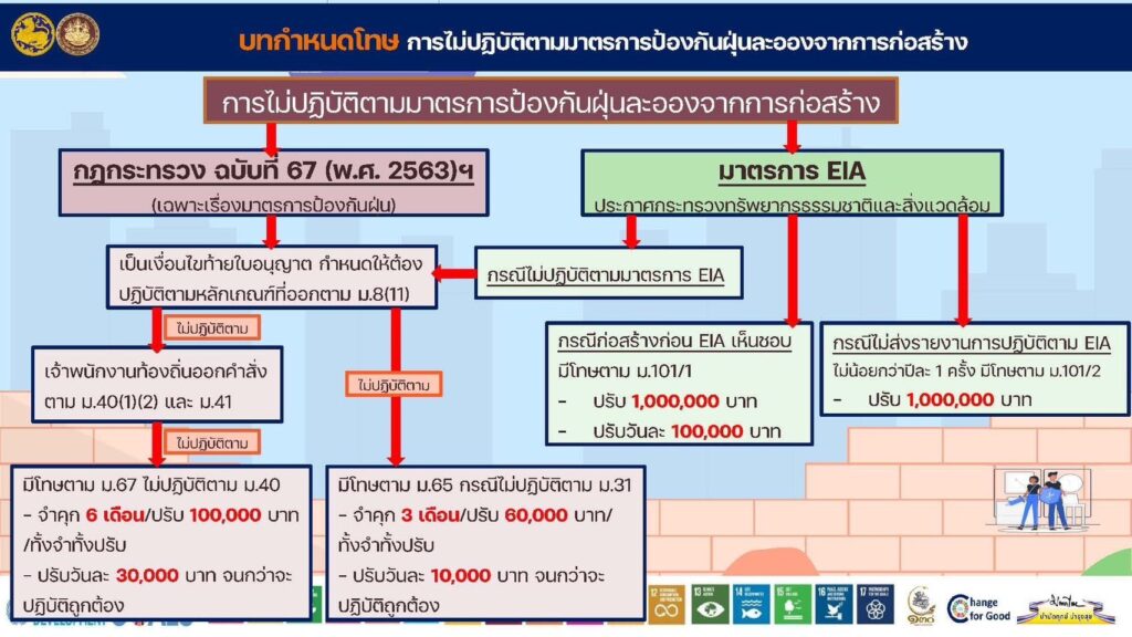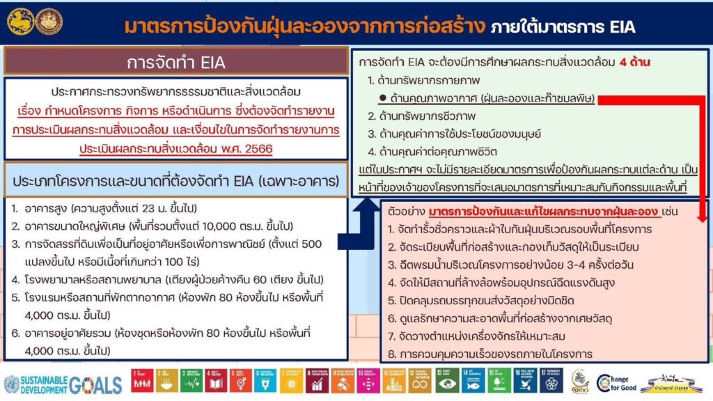 การก่อสร้างอาคารที่มีความสูงตั้งแต่ 10.00 เมตรขึ้นไป ที่มีระยะราบวัดจากแนวอาคารด้านนอก ถึงที่สาธารณะหรือที่ดินต่างเจ้าของหรือผู้ครอบครองน้อยกว่ากึ่งหนึ่งของความสูงของอาคารนั้น หรืออาคารซึ่งอยู่ในโครงการจัดสรรที่ดินตามกฎหมายว่าด้วยการจัดสรรที่ดิน ผู้ดําเนินการต้องจัดให้มีมาตรการป้องกันฝุ่นละออง ดังต่อไปนี้