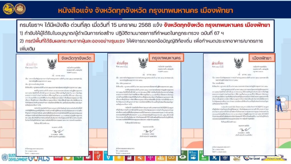 นายพงษ์นรา เย็นยิ่ง อธิบดีกรมโยธาธิการและผังเมือง กล่าวว่า รัฐบาลให้ความสำคัญกับการแก้ไขปัญหาฝุ่น PM 2.5 เป็นอันดับต้น ๆ โดยมีการตั้งคณะกรรมการแห่งชาติด้านการป้องกันและแก้ไขปัญหาไฟป่า การเผา ในที่โล่ง หมอกควัน และฝุ่นละออง ให้เป็นไปตามกลไกการบริหารจัดการทั้งในระดับชาติและระดับพื้นที่ เน้นย้ำให้ทุกฝ่ายที่เกี่ยวข้องทำงานเชิงรุก ใช้กลไกและกฎหมายที่มีอยู่ในปัจจุบัน ให้ทุกหน่วยงานนำไปปรับใช้ เพื่อกำหนดมาตรการให้มีความเข้มข้นและเป็นรูปธรรม