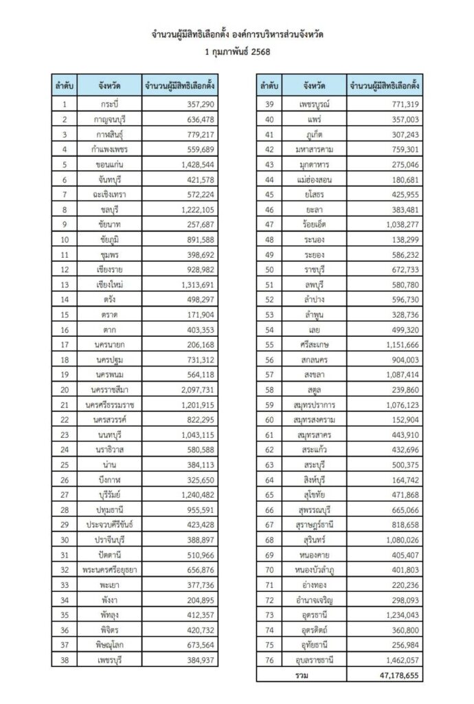 สำนักงาน กกต. เปิดตัวเลขผู้มีสิทธิเลือกตั้งสมาชิกและนายกองค์การบริหารส่วนจังหวัด (อบจ.) ที่จะมีการเลือกตั้งในวันเสาร์ที่ 1 กุมภาพันธ์นี้ พบว่าตัวเลขผู้มีสิทธิเลือกตั้งทั่วประเทศ 76 จังหวัด จำนวน 47,178,655 คน