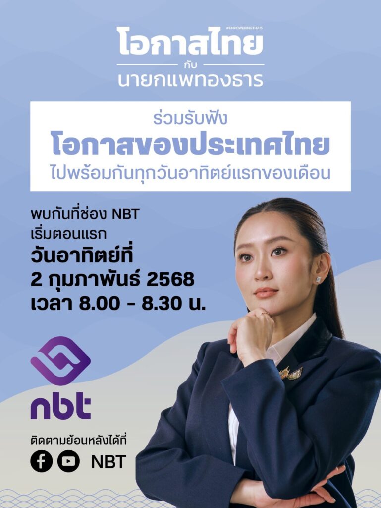 นายจิรายุ ห่วงทรัพย์ โฆษกประจำสำนักนายกรัฐมนตรี เปิดเผยว่า ในวันอาทิตย์ที่ 2 กุมภาพันธ์ 2568 นี้ นางสาวแพทองธาร ชินวัตร นายกรัฐมนตรีจะสื่อสารกับประชาชนในรูปแบบรายการโทรทัศน์ ที่มีชื่อว่า “โอกาสไทยกับนายกแพทองธาร” #EmpoweringThais ซึ่งจะออกอากาศทุกวันอาทิตย์ต้นเดือน ทุกเดือนนับจากนี้ โดยจะออกอากาศครั้งแรกในเช้าวันอาทิตย์ที่ 2 กุมภาพันธ์ 2568 นี้ เวลา 08:00 – 08.30 น. ทางสถานีวิทยุโทรทัศน์แห่งประเทศไทย NBT HD2 และวิทยุเครือข่ายกรมประชาสัมพันธ์ทั่วประเทศ รวมถึงคลื่นวิทยุในส่วนราชการต่าง ๆ นอกจากนี้ ยังสามารถรับชมผ่านทางโซเชียลมีเดียได้ในทุกช่องทางของรัฐบาล ทั้ง เว็บไซต์รัฐบาลไทย และสื่อ social ไทยคู่ฟ้า และเว็บไซต์ของกรมประชาสัมพันธ์ และประชาสัมพันธ์จังหวัดทั่วประเทศ