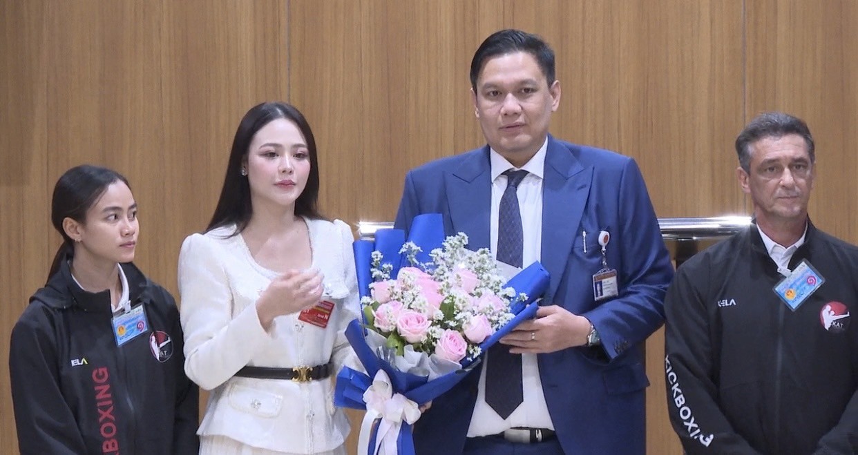 นายไผ่ ลิกค์ สส.กำแพงเพชรพรรคกล้าธรรม ในฐานะนายกสมาคมกีฬาคิกบ็อกซิงแห่งประเทศไทย รับกระเช้าดอกไม้แสดงความยินดีและเป็นกำลังใจจาก น.ส.ทิรา บุญาณี กิตติกรณ์ เลขาธิการสมาคมกีฬาคิกบ็อกซิงแห่งประเทศไทย