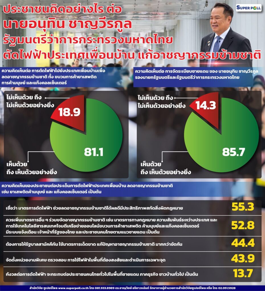เมื่อวันที่ 2 ก.พ. 2568 ที่สำนักวิจัยซูเปอร์โพล ดร.ชาญวิชย์ อริยาวรนันต์ รักษาการ ผู้อำนวยการสำนักวิจัยซูเปอร์โพล เสนอผลสำรวจเรื่อง “ประชาชน คิดอย่างไร ต่อ นายอนุทิน ชาญวีรกูล ตัดไฟฟ้าประเทศเพื่อนบ้านแก้อาชญากรรมข้ามชาติ ”กรณีศึกษาตัวอย่างประชาชนทุกสาขาอาชีพทั่วประเทศ ดำเนินโครงการทั้งการวิจัยเชิงปริมาณ และการวิจัยเชิงคุณภาพ รวมจำนวนตัวอย่างในการวิเคราะห์ทางสถิติทั้งสิ้นจำนวนทั้งสิ้น 1,143 ตัวอย่าง ดำเนินโครงการระหว่างวันที่ 31 ม.ค. – 1 ก.พ. 2568 ที่ผ่านมา