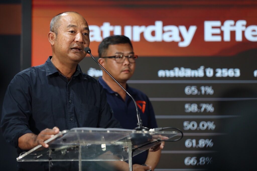 นายงศรายุทธิ์ ระบุว่า ที่ผ่านมามีประชาชนและสื่อมวลชนหลายคนอยากทราบว่าการเลือกตั้งวันเสาร์มีผลกระทบอย่างไรบ้าง ซึ่งจากการตรวจสอบข้อมูลเบื้องต้น พบข้อมูลที่น่าสนใจคือสัดส่วนผู้มาใช้สิทธิลดลงจาก 62% มาอยู่ที่ประมาณ 55% หมายความว่าคะแนนหายไป 7-8% หรือราว 2 ล้านกว่าคนที่ไม่ได้มีส่วนร่วมในการเลือกตั้งครั้งนี้ ซึ่งน่าจะมีผลมาจากการเลือกตั้งวันเสาร์ โดยบางจังหวัดมีผู้มาใช้สิทธิลดลงอย่างมีนัยสำคัญ เช่น ที่จันทบุรีสัดส่วนผู้มาใช้สิทธิเลือกตั้งลดลงถึง 15% ภูเก็ตลดลงกว่า 11% นนทบุรีลดลงกว่า 9% สมุทรปราการ สุราษฎร์ธานี ชลบุรี และระยอง ลดลงกว่า 7-8% ซึ่งจำนวนตัวเลขผู้ไม่ได้มาใช้สิทธิแต่ละที่อาจจะส่งผลต่อผลการเลือกตั้งด้วย