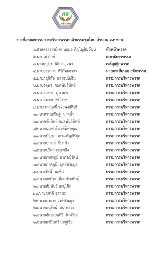 ผู้สื่อข่าวรายงานอีกว่า สำหรับรายชื่อกรรมการบริหารชุดใหม่นั้น นางนฤมล จะยังคงดำรงตำแหน่งหัวหน้าพรรค โดยมีนายไผ่ เป็นเลขาธิการพรรค นางบุญยิ่ง นิติกาญจนา ส.ส.ราชบุรี พรรค กธ. เป็นเหรัญญิกพรรค ขณะที่นายอรรธกร เป็นนายทะเบียนพรรค .314.-สำนักข่าวไทย