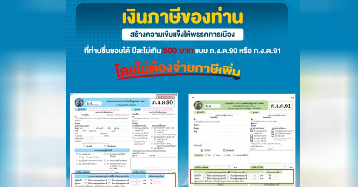 สำนักงานคณะกรรมการการเลือกตั้ง ขอเชิญชวนผู้เสียภาษีเงินได้ที่เป็นบุคคลธรรมดา เข้ามามีส่วนร่วมทางการเมืองและร่วมเป็นส่วนหนึ่งในการสร้างความเข้มแข็งให้แก่พรรคการเมือง โดยบริจาคเงินภาษีให้แก่พรรคการเมืองที่ท่านชื่นชอบ ในแบบแสดงรายการภาษีเงินได้บุคคลธรรมดา ประจำปีภาษี 2567 (ภ.ง.ด.90 หรือ ภ.ง.ด.91) ซึ่งผู้ชำระภาษีแสดงเจตนาด้วยการทำเครื่องหมายในช่องประสงค์อุดหนุนเงินภาษี พร้อมทั้งกรอกจำนวนเงินภาษีที่จะอุดหนุนได้ไม่เกิน 500 บาท โดยไม่ต้องจ่ายเงินภาษีเพิ่มแต่อย่างใด กรมสรรพากรจะดำเนินการรวบรวมและจัดทำรายชื่อพรรคการเมืองที่ได้รับเงินอุดหนุนพร้อมยอดรวมเงินภาษีของแต่ละพรรคการเมือง ส่งนายทะเบียนพรรคการเมือง พร้อมกับโอนเงินดังกล่าวให้กองทุนเพื่อการพัฒนาพรรคการเมือง เพื่อนำมาจัดสรรเป็นเงินอุดหนุนประจำปีให้แก่พรรคการเมืองต่อไป