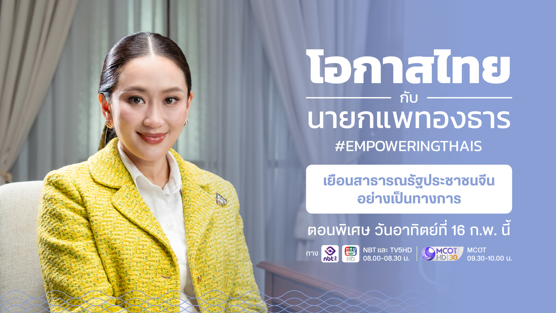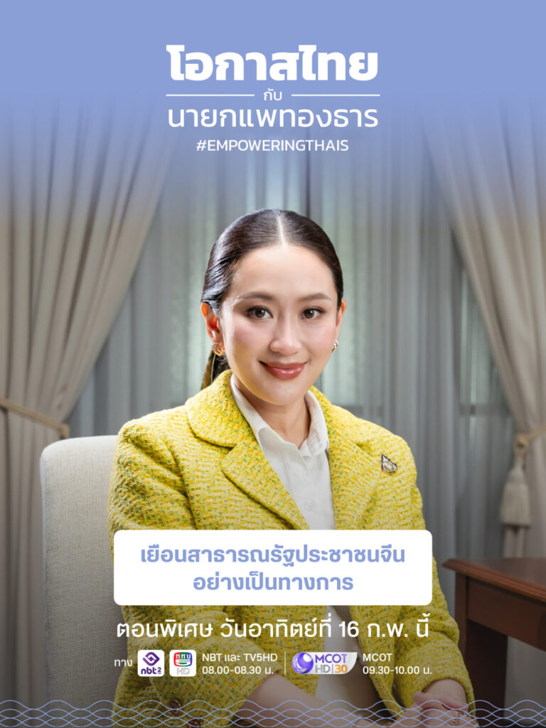นายจิรายุ ห่วงทรัพย์ โฆษกประจำสำนักนายกรัฐมนตรี เปิดเผยว่า ในวันอาทิตย์ที่ 16 กุมภาพันธ์ นี้ เวลา 08.00-08.30 น. นายกรัฐมนตรีจะจัดรายการพิเศษชื่อว่า “โอกาสไทยกับนายกแพทองธารตอนพิเศษ” เพื่อสรุปผลการเดินทางไปเยือนประเทศจีนอย่างเป็นทางการของรัฐบาล โดยจะออกอากาศพร้อมกันทางสถานีโทรทัศน์แห่งประเทศไทย กรมประชาสัมพันธ์ NBT2 HD และ TV5 เวลา 08.00-08.30 น. และทาง ช่อง 9 MCOT HD เวลา 09.30-10.00 น. และวิทยุเครือข่ายกรมประชาสัมพันธ์ทั่วประเทศ