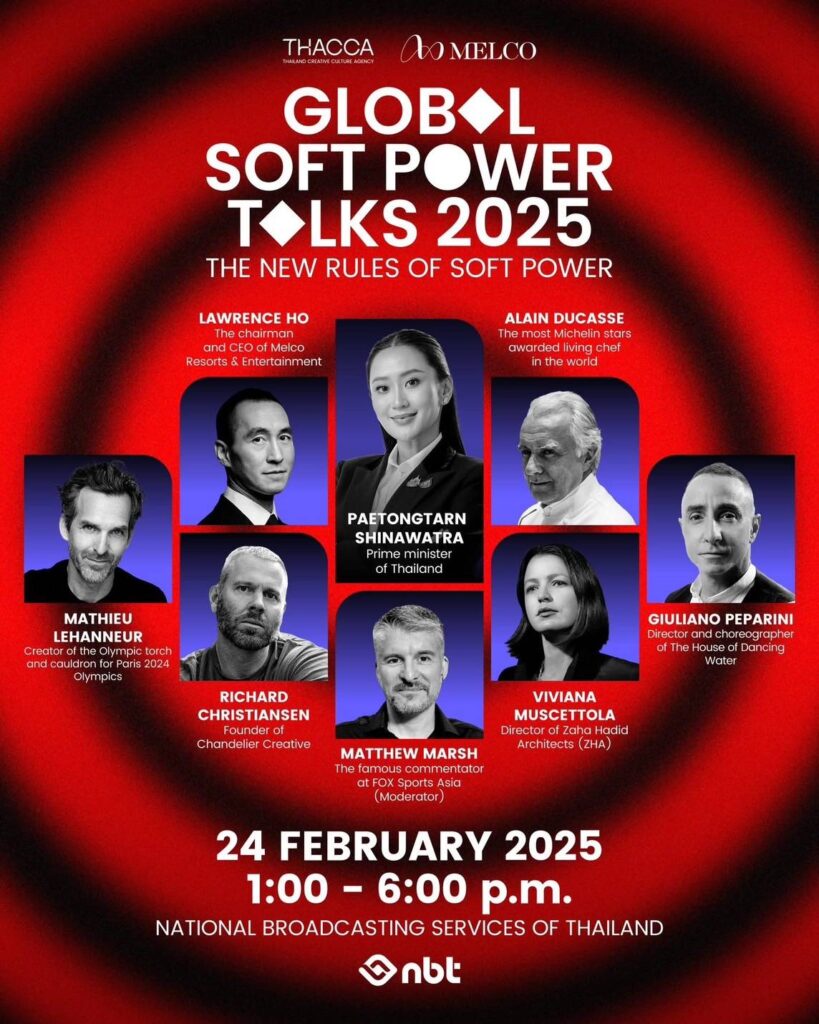 นางสาวจิราพร สินธุไพร รัฐมนตรีประจำสำนักนายกรัฐมนตรี เปิดเผยว่า รัฐบาลโดยคณะกรรมการยุทธศาสตร์ซอฟต์พาวเวอร์แห่งชาติ และ Melco Resorts & Entertainment บริษัทผู้นำด้านอุตสาหกรรมความบันเทิงครบวงจรระดับโลก ร่วมมือกันจัดงาน “THACCA Global Soft Power Talks” เวทีซอฟต์พาวเวอร์ระดับโลก ภายใต้หัวข้อ “The New Rules of Soft Power” ในวันที่ 24 กุมภาพันธ์ 2568 ณ อาคาร NBT ถนนวิภาวดีรังสิต กรุงเทพฯ