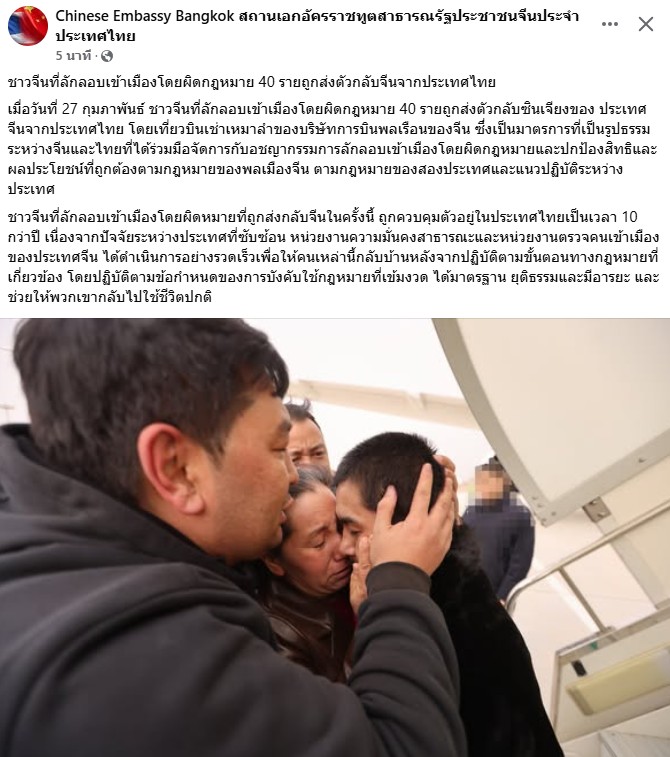เพจ “Chinese Embassy Bangkok สถานเอกอัครราชทูตสาธารณรัฐประชาชนจีนประจำประเทศไทย” เผยแพร่ข้อความ หลังเกิดกระแสข่าวทางการไทยส่งตัวชาวอุยกูร์ จำนวน 40 คน กลับไปยังสาธารณรัฐประชาชนจีน เมื่อช่วงเช้ามืดวันนี้ (27 ก.พ.) ว่า เมื่อวันที่ 27 กุมภาพันธ์ ชาวจีนที่ลักลอบเข้าเมืองโดยผิดกฎหมาย 40 รายถูกส่งตัวกลับซินเจียงของประเทศจีนจากประเทศไทย โดยเที่ยวบินเช่าเหมาลำของบริษัทการบินพลเรือนของจีน ซึ่งเป็นมาตรการที่เป็นรูปธรรมระหว่างจีนและไทยที่ได้ร่วมมือจัดการกับอาชญากรรมการลักลอบเข้าเมืองโดยผิดกฎหมาย และปกป้องสิทธิและผลประโยชน์ที่ถูกต้องตามกฎหมายของพลเมืองจีน ตามกฎหมายของสองประเทศและแนวปฏิบัติระหว่างประเทศ