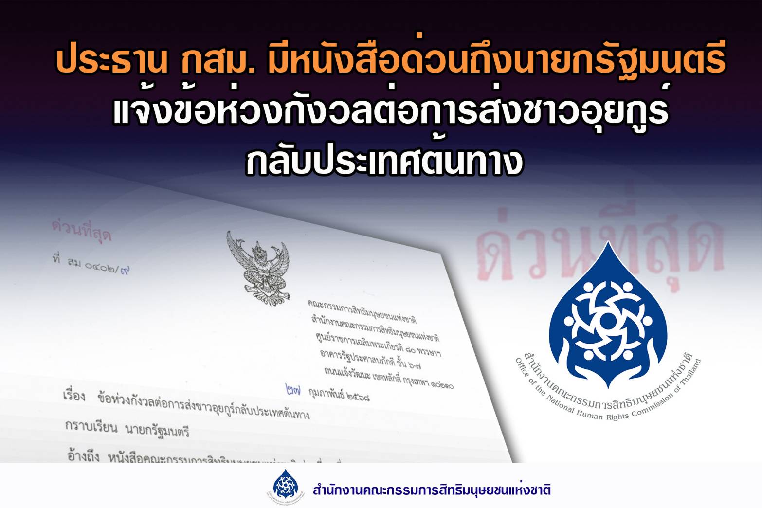 ด้วยเหตุผลดังกล่าว ประธานกรรมการสิทธิมนุษยชนแห่งชาติ จึงมีหนังสือด่วนที่สุด ลงวันที่ 27 กุมภาพันธ์ 2568 ถึงนายกรัฐมนตรี แจ้งข้อห่วงกังวลต่อการส่งชาวอุยกูร์กลับประเทศต้นทาง โดยขอให้ พิจารณาเรื่องนี้ ดังนี้ 1.การส่งชาวอุยกูร์กลับประเทศต้นทางจะกระทบต่อความน่าเชื่อถือของไทยในฐานะสมาชิก คณะมนตรีสิทธิมนุษยชนแห่งสหประชาชาติ (HRC) เนื่องจากขัดต่อเจตนารมณ์และคำมั่นของประเทศไทยที่ จะส่งเสริมการเคารพและคุ้มครองสิทธิมนุษยชนที่ได้ให้ไว้ในการรณรงค์หาเสียงในการสมัครรับเลือกตั้งเป็น สมาชิก HRC การที่ไทยได้รับเลือกเป็นสมาชิก HRC เมื่อเดือนตุลาคม 2567 ที่ผ่านมาด้วยคะแนนสูงที่สุด สะท้อนให้เห็นว่าประเทศต่าง ๆ มีความเชื่อมั่นต่อนโยบาย ความมุ่งมั่น และการดำเนินการของไทย ในการส่งเสริมและคุ้มครองสิทธิมนุษยชนในหลายด้าน เช่น การออกกฎหมายเพื่อป้องกันและปราบปราม การทรมานและการทำให้บุคคลสูญหาย ตามพันธกรณีในอนุสัญญา CAT ได้อย่างมีประสิทธิผล การดูแล ผู้หนีภัยสู้รบชาวเมียนมา การแก้ไขปัญหาสถานะและสิทธิของบุคคล เป็นต้น