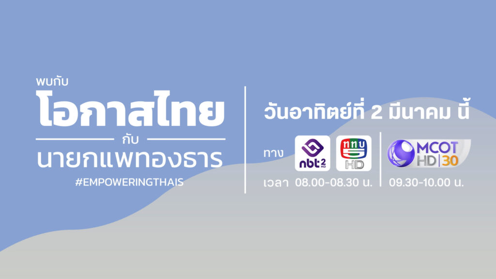 ซึ่งนายกรัฐมนตรีได้อธิบายถึงโอกาสที่เกิดขึ้นให้คนไทยเตรียมพร้อมอย่างไร เพื่อรับโอกาสนี้ ขอเชิญรับชมและรับฟังได้ที่รายการ ‘โอกาสไทยกับนายกแพทองธาร’ วันอาทิตย์ที่ 2 มี.ค. นี้ เวลา 08.00 – 08.30 น. ทางสถานีโทรทัศน์ BNT 2HD และTV5 และสถานีวิทยุกระจายเสียงแห่งประเทศไทยเครือข่ายกรมประชาสัมพันธ์ทั่วประเทศ ขณะที่ช่อง9 MCOT HD จะออกอากาศเวลา09.30-10:00 น.นายจิรายุกล่าว .314.-สำนักข่าวไทย