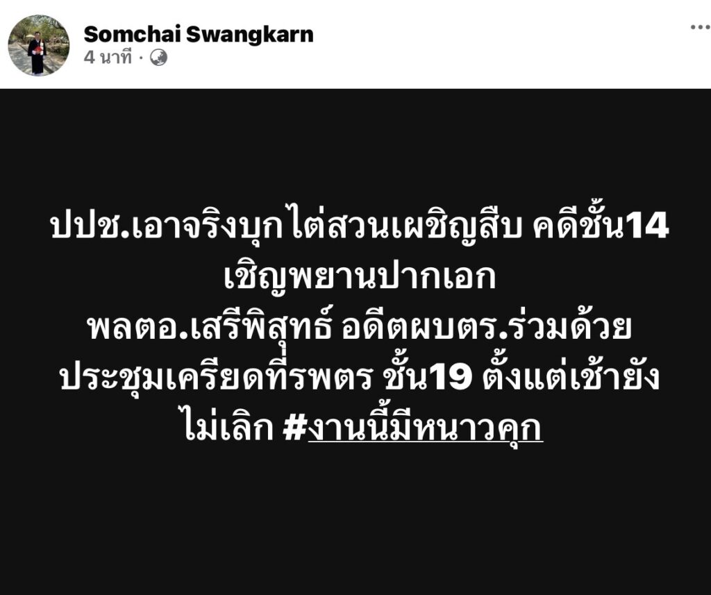 ขณะเดียวกันนายสมชาย แสวงการ อดีตสว.ได้โพสต์ข้อความในเฟซบุ๊กส่วนตัว ระบุว่า “ป.ป.ช.เอาจริงบุกไต่สวนเผชิญสืบคดีชั้น 14 เชิญพยานปากเอกพล.ต.อ.เสรีพิศุทธ์ อดีต ผบ.ตร ร่วมด้วย ประชุมเครียดที่ รพ.ตร.ชั้น 19 แต่เช้ายังไม่เลิก #งานนี้มีหนาวคุก” .314.-สำนักข่าวไทย