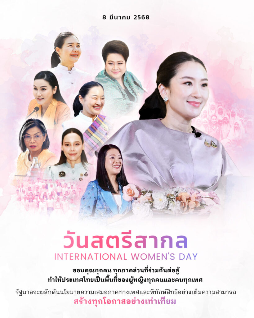 “เนื่องในวันสตรีสากล นายกรัฐมนตรี ขอบคุณประชาชนทุกคน ที่มีความเชื่อมั่นเชื่อใจ และส่งกำลังใจมาให้ ในฐานะผู้นำประเทศ และขอให้ผู้หญิงทุกคน เชื่อมั่นในตัวเองว่า จะสามารถก้าวขึ้นไปเป็นผู้นำได้ในทุกเวทีทุกระดับ ทุกอาชีพ อย่างเท่าเทียมกัน ในฐานะผู้นำหญิงของประเทศ ไม่เพียงแต่จะส่งเสริมบทบาทของสตรีเท่านั้น แต่จะร่วมกับมือกับทุกกระทรวง ขับเคลื่อนนโยบายความเสมอภาคทางเพศอย่างเต็มความสามารถ ทั้งในระดับครอบครัว สถาบันการศึกษา และสถานประกอบการ” นายจิรายุ กล่าว.-319 -สำนักข่าวไทย