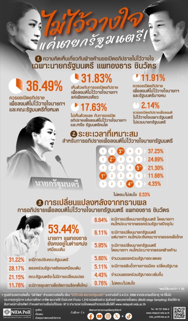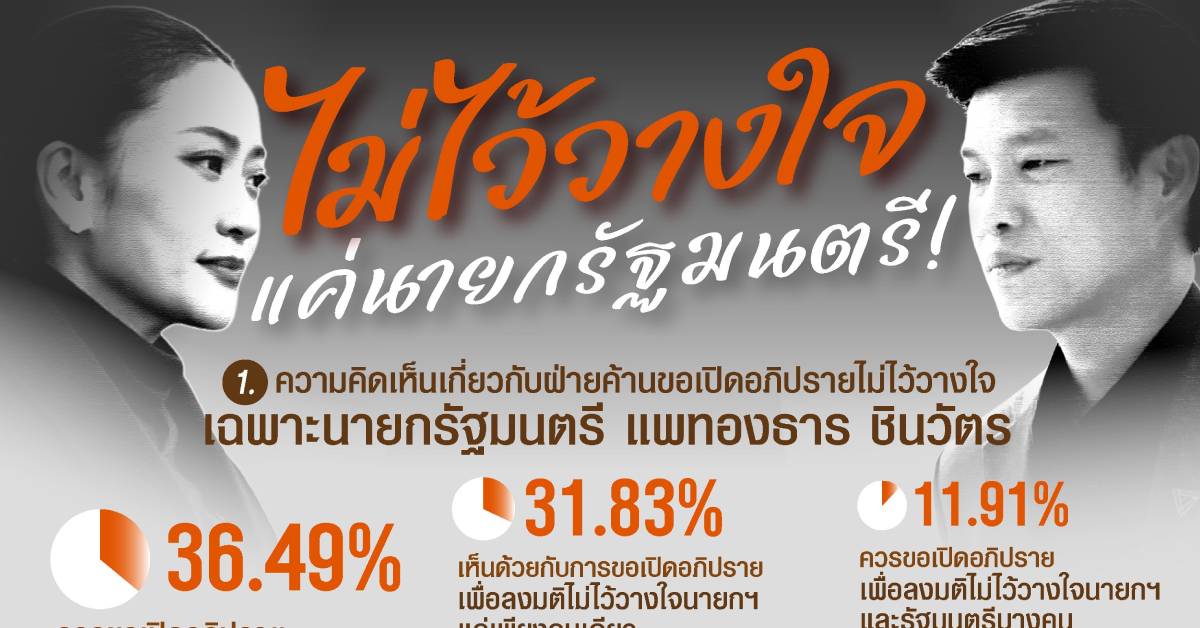 จากการสำรวจ นิด้าโพล เมื่อถามประชาชนถึงความคิดเห็นเกี่ยวกับฝ่ายค้านขอเปิดอภิปรายไม่ไว้วางใจเฉพาะนายกรัฐมนตรี แพทองธาร ชินวัตร พบว่า ร้อยละ 36.49 ระบุว่า ควรขอเปิดอภิปรายเพื่อลงมติไม่ไว้วางใจนายกฯ และคณะรัฐมนตรีทั้งหมด ร้อยละ 31.83 ระบุว่า เห็นด้วยกับการขอเปิดอภิปรายเพื่อลงมติไม่ไว้วางใจนายกฯ แค่เพียงคนเดียว ร้อยละ 17.63 ระบุว่า ไม่เห็นด้วยกับการขอเปิดอภิปรายเพื่อลงมติไม่ไว้วางใจนายกหรือรัฐมนตรีคนใด ร้อยละ 11.91 ระบุว่า ควรขอเปิดอภิปรายเพื่อลงมติไม่ไว้วางใจนายกฯ และรัฐมนตรีบางคน ร้อยละ 2.14 ระบุว่า ควรขอเปิดอภิปรายเพื่อลงมติไม่ไว้วางใจเฉพาะรัฐมนตรี ไม่รวมนายกรัฐมนตรี