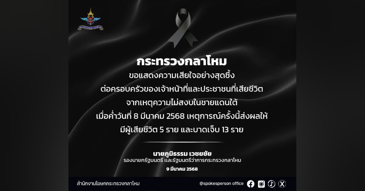 กลาโหม 9 มี.ค. – กลาโหม แสดงความเสียใจ ต่อครอบครัวผู้สูญเสียจากเหตุความไม่สงบชายแดนใต้ และขอช่วยกันประณาม กลุ่มที่ก่อเหตุในครั้งนี้ พร้อมสั่งคุมเข้มพื้นที่ ป้องกันเหตุซ้ำ