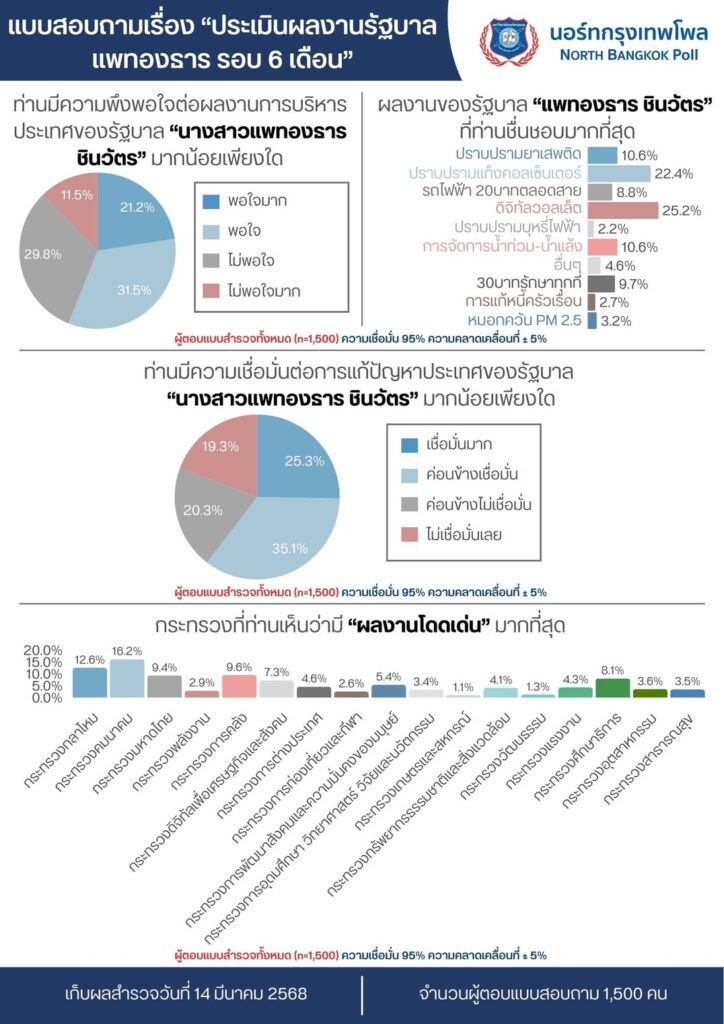 มหาวิทยาลัยนอร์ทกรุงเทพ 16 มี.ค.- ผลสำรวจพบประชาชน 52.7% พึงพอใจผลงาน “รัฐบาลแพทองธาร รอบ 6 เดือน” ชื่นชอบนโยบายดิจิทัลวอลเล็ต-ปราบปรามแก๊งคอลเซ็นเตอร์