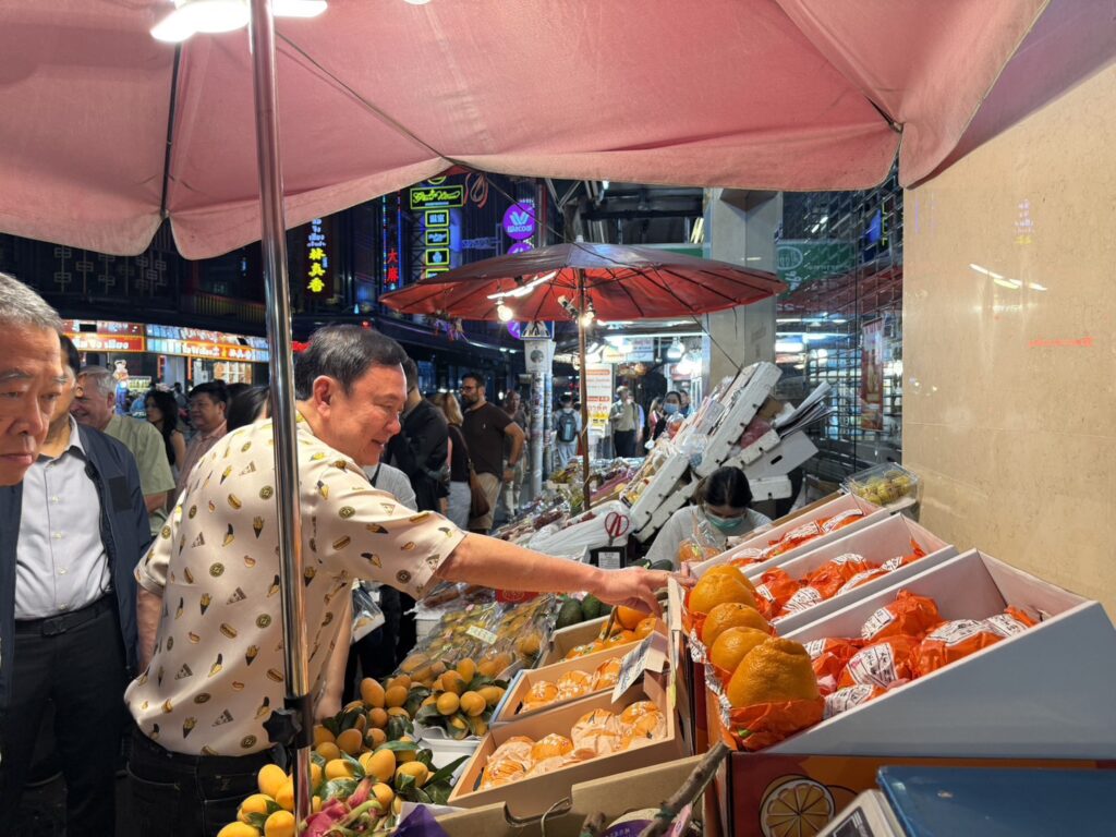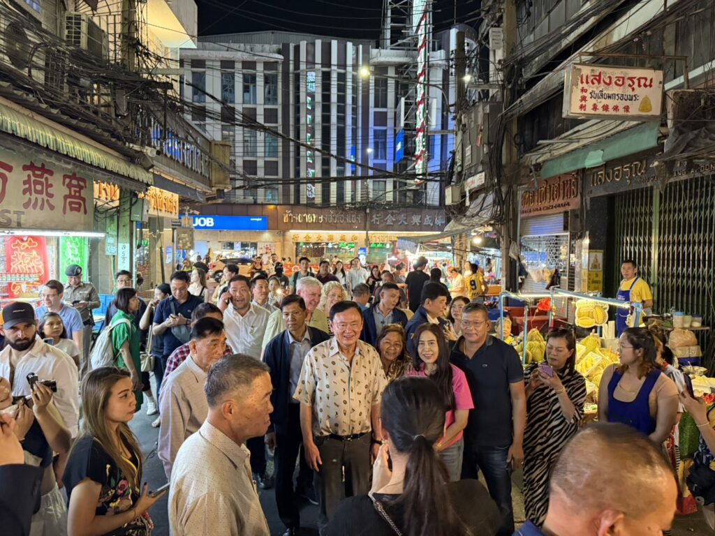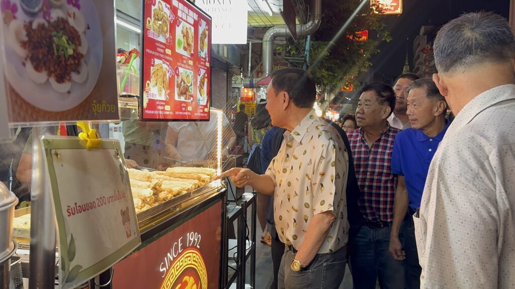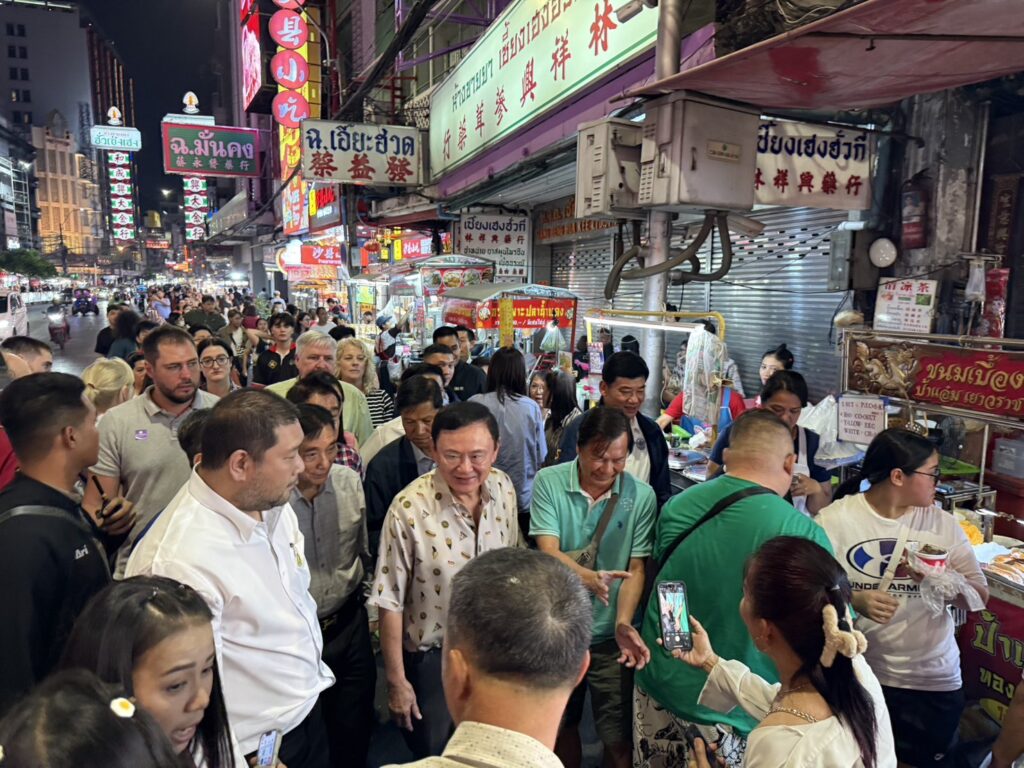จากนั้นนายทักษิณได้เดินเที่ยวชมบรรยากาศการค้าขายของย่านเยาวราช จากร้านหูฉลามถึงถนนมังกร โดยได้ซื้อเกาลัดและแวะกินบะหมี่มังกรขาว โดยมีนักท่องเที่ยวทั้งชาวไทยและชาวต่างชาติ รวมถึงพ่อค้าแม่ค้าย่านเยาวราช ขอถ่ายรูปคู่เป็นจำนวนมาก บางคนเข้ามาขอลายเซ็นและขอจับมือด้วย พร้อมบอกด้วยว่าชอบมาตั้งแต่สมัยพรรคไทยรักไทย