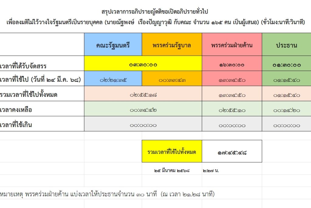 ผู้สื่อข่าวรายงานถึงผลสรุปเวลาการอภิปรายไม่ไว้วางใจคณะรัฐมนตรีเป็นรายบุคคล ในวันแรก (24 มี.ค. 68) บรรยากาศเป็นไปอย่างราบรื่น โดยฝ่ายค้านใช้เวลาไป 13.34 ชั่วโมง จากเวลาที่ได้รับจัดสรร 16.30 ชั่วโมง (จากเดิม 17 ชั่วโมง แบ่งไปให้ประธาน 30 นาที) , ฝ่ายรัฐบาลใช้เวลา 2.55 ชั่วโมง จากที่ได้รับจัดสรร 3.5 ชั่วโมง โดยแบ่งเป็น คณะรัฐมนตรีใช้เวลา 2.21 ชั่วโมง, พรรคร่วมรัฐบาล 33.43 นาที และประธานใช้เวลาไป 1.15 ชั่วโมง จากเวลาที่ได้รับจัดสรร 1.5 ชั่วโมง (จากเดิม 1 ชั่วโมง แต่ได้จากฝ่ายค้านเพิ่ม 30 นาที) รวมเวลาที่ใช้ไปทั้งหมดของทุกฝ่าย 17.45 ชั่วโมง