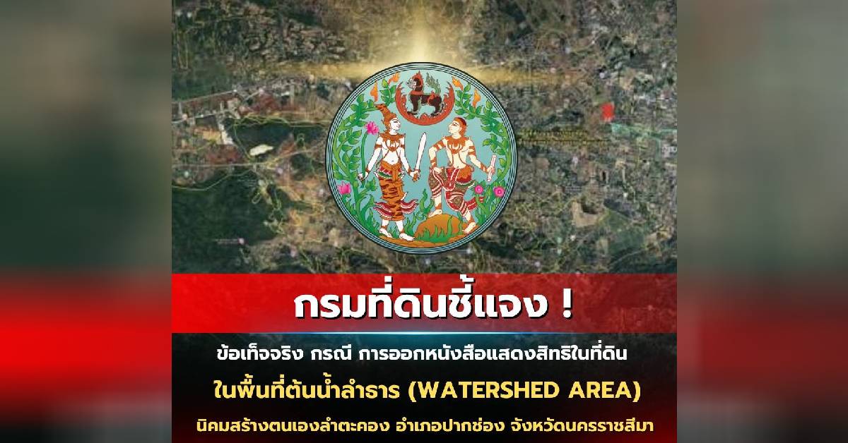 กทม. 25 มี.ค.-กรมที่ดิน ชี้แจงกรณีการออกหนังสือแสดงสิทธิในที่ดิน พื้นที่ต้นน้ำลำธาร (WATERSHED AREA) นิคมสร้างตนเองลำตะคอง อ.ปากช่อง จ.นครราชสีมา