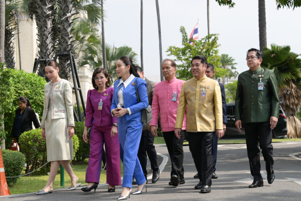 นางสาวแพทองธาร ชินวัตร นายกรัฐมนตรี เป็นประธานการประชุม ครม. วันนี้ (27 มี.ค.) โดยสวมชุดผ้าไทยสีฟ้า เดินจากตึกไทยคู่ฟ้ามาพร้อมกับรัฐมนตรี ยิ้มแย้มทักทายสื่อมวลชน ก่อนจะบอกว่า วันนี้ ดูเงียบ ๆ ผู้สื่อข่าวจึงบอกว่า อยากให้ถามหรือไม่ นายกรัฐมนตรี ตอบกลับขำ ๆ ว่า “ไม่เป็นไร ไม่ถามก็ได้ ตอบเหนื่อยแล้ว ตอบเหนื่อยแล้ว วันนี้เงียบๆ ไม่มีเสียงอะไรเลย”