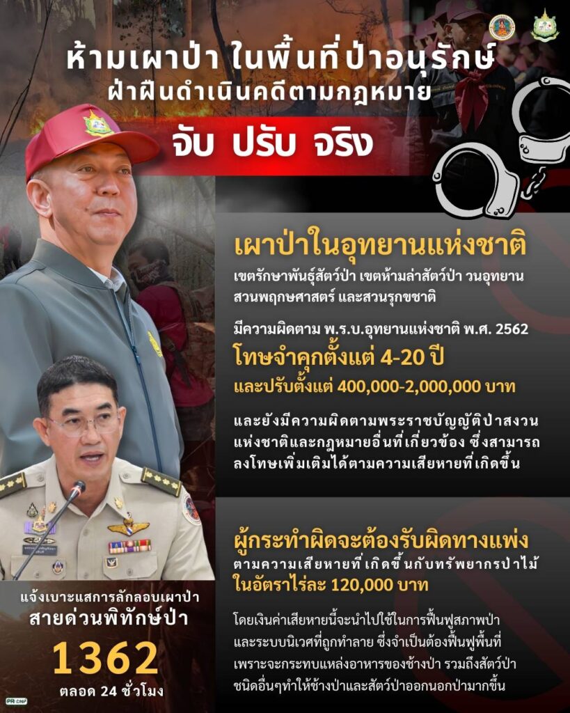 นายคารม กล่าวว่า สำหรับในปีงบประมาณ พ.ศ. 2568 กระทรวงทรัพยากรธรรมชาติและสิ่งแวดล้อม ได้มีมาตรการเชิงรุกในการบังคับใช้กฎหมาย ดำเนินคดีที่เกี่ยวข้องกับการเผาป่าอย่างจริงจัง โดยกรมอุทยานแห่งชาติ สัตว์ป่า และพันธุ์พืช ดำเนินการจับกุมผู้กระทำความผิดในพื้นที่ป่าอนุรักษ์แล้วทั้งสิ้น จำนวน 63 คดี ผู้ต้องหา 21 คน พื้นที่เสียหาย 2,772 -0 -64.25 ไร่ และกรมป่าไม้ ดำเนินการในพื้นที่ป่าสงวนแห่งชาติแล้วทั้งสิ้น จำนวน 94 คดี พื้นที่เสียหาย 6,044 ไร่ (ข้อมูล ณ วันที่ 27 มี.ค. 68) ทั้งนี้ การกระทำความผิดฐานเผาป่า นอกจากจะถูกดำเนินคดีตามพระราชบัญญัติอุทยานแห่งชาติ พ.ศ. 2562 มีโทษจำคุกตั้งแต่ 4-20 ปี และปรับตั้งแต่ 400,000-2,000,000 บาท ยังมีความผิดตามพระราชบัญญัติป่าสงวนแห่งชาติและกฎหมายอื่นที่เกี่ยวข้อง ซึ่งสามารถลงโทษเพิ่มเติมได้ตามความเสียหายที่เกิดขึ้น นอกจากนี้ ผู้กระทำผิดจะต้องรับผิดทางแพ่งต่อความเสียหายที่เกิดขึ้นกับทรัพยากรป่าไม้ในอัตราไร่ละ 120,000 บาท โดยเงินค่าเสียหายนี้จะนำไปใช้ในการฟื้นฟูสภาพป่าและระบบนิเวศที่ถูกทำลายจากไฟป่า .314.-สำนักข่าวไทย