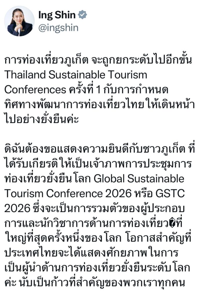 ดิฉันต้องขอแสดงความยินดีกับชาวภูเก็ต ที่ได้รับเกียรติให้เป็นเจ้าภาพการประชุมการท่องเที่ยวยั่งยืนโลก Global Sustainable Tourism Conference 2026 หรือ GSTC 2026 ซึ่งจะเป็นการรวมตัวของผู้ประกอบการและนักวิชาการด้านการท่องเที่ยวที่ใหญ่ที่สุดครั้งหนึ่งของโลก โอกาสสำคัญที่ประเทศไทยจะได้แสดงศักยภาพในการเป็นผู้นำด้านการท่องเที่ยวยั่งยืนระดับโลกค่ะ นับเป็นก้าวที่สำคัญของพวกเราทุกคน และงานประชุม Thailand Sustainable Tourism Conferences ครั้งที่ 1 ในวันนี้ เกิดขึ้นจากการร่วมกันผลักดันของมูลนิธิพัฒนาการท่องเที่ยวยั่งยืน พร้อมภาคีเครือข่ายการท่องเที่ยวทั้งภาครัฐ ภาคเอกชน และภาคประชาชน เวทีนี้เป็นเวทีสำคัญในการกำหนดทิศทางการพัฒนาการท่องเที่ยวของประเทศไทยให้เดินหน้าไปอย่างยั่งยืน ซึ่งเป็นเรื่องที่พวกเราทุกคนต้อง ทำความเข้าใจ และปรับตัวให้ทันต่อการเปลี่ยนแปลง