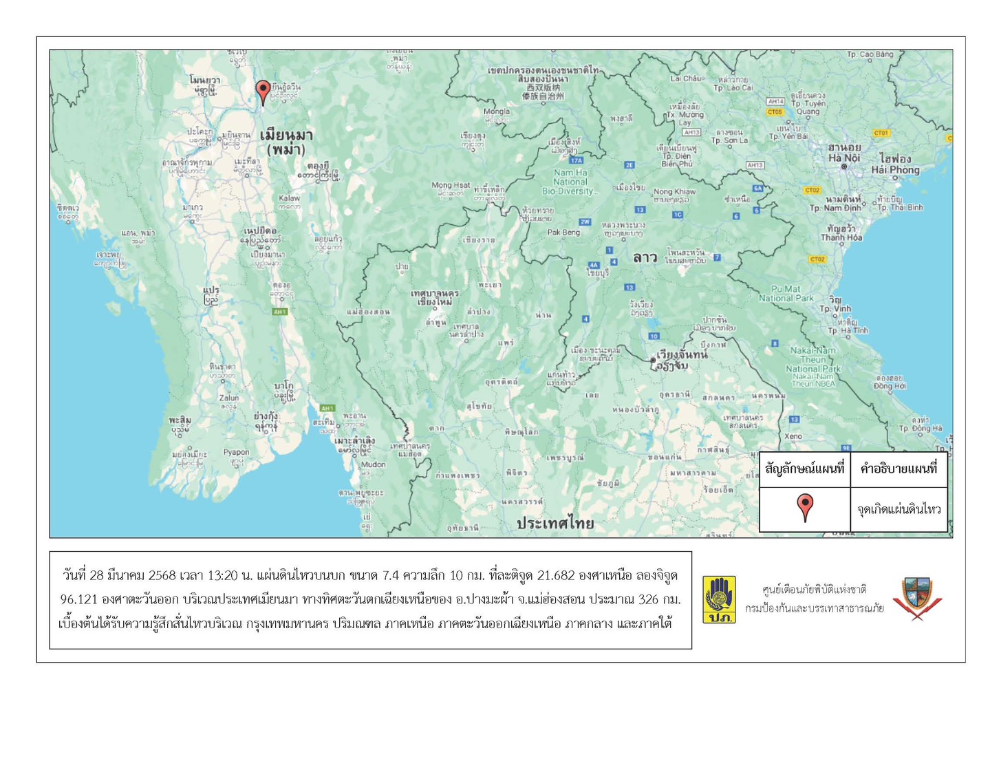 กรมอุตุนิยมวิทยาได้มีประกาศแจ้งว่าเมื่อเวลา 13.20 น. เกิดแผ่นดินไหว จุดศูนย์กลางอยู่บริเวณประเทศเมียนมา ที่ละติจูด 21.682 องศาเหนือ ลองติจูด 96.121 องศาตะวันออก ขนาด 7.4 ความลึก 10 กิโลเมตร ทางทิศตะวันตกเฉียงเหนือของ อ.ปางมะผ้า จ.แม่ฮ่องสอน ประมาณ 326 กม. เบื้องต้นได้รับความรู้สึกสั่นไหวบริเวณกรุงเทพมหานคร ปริมณฑล ภาคเหนือ ภาคตะวันออกเฉียงเหนือ ภาคกลาง และภาคใต้ ขณะนี้อยู่ในระหว่างการตรวจสอบข้อมูลและความเสียหาย ซึ่งกรมป้องกันและบรรเทาสาธารณภัยจะรายงานสถานการณ์ให้ทราบต่อไป