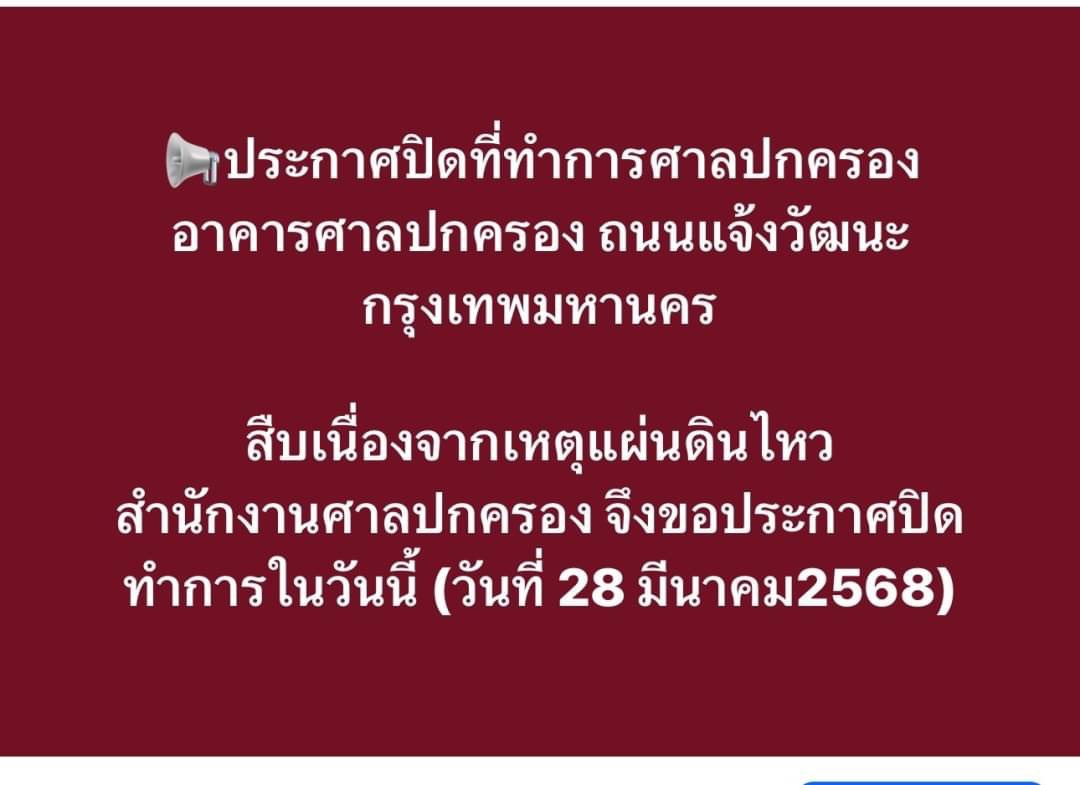 ศาลปกครอง วันนี้ ( 28 มี.ค.) เวลา 13.30 น. สำนักงานศาลปกครองประกาศปิดที่ทำการศาลปกครอง อาคารศาลปกครอง ถนนแจ้งวัฒนะ สืบเนื่องจากเหตุแผ่นดินไหว ทำให้การนัดอ่านคำพิพากษาหลายคดีของศาลปกคลอง ทั้งศาลปกครองกลาง และศาลปกครองสูงสุด ตลอดช่วงบ่าย ต้องเลื่อนออกไปอย่างไม่มีกำหนด ในจำนวนนี้ รวมถึงคดีพิพาทเกี่ยวกับการถอดถอนอดีตอธิการบดีมหาวิทยาลัยรามคำแหงด้วย