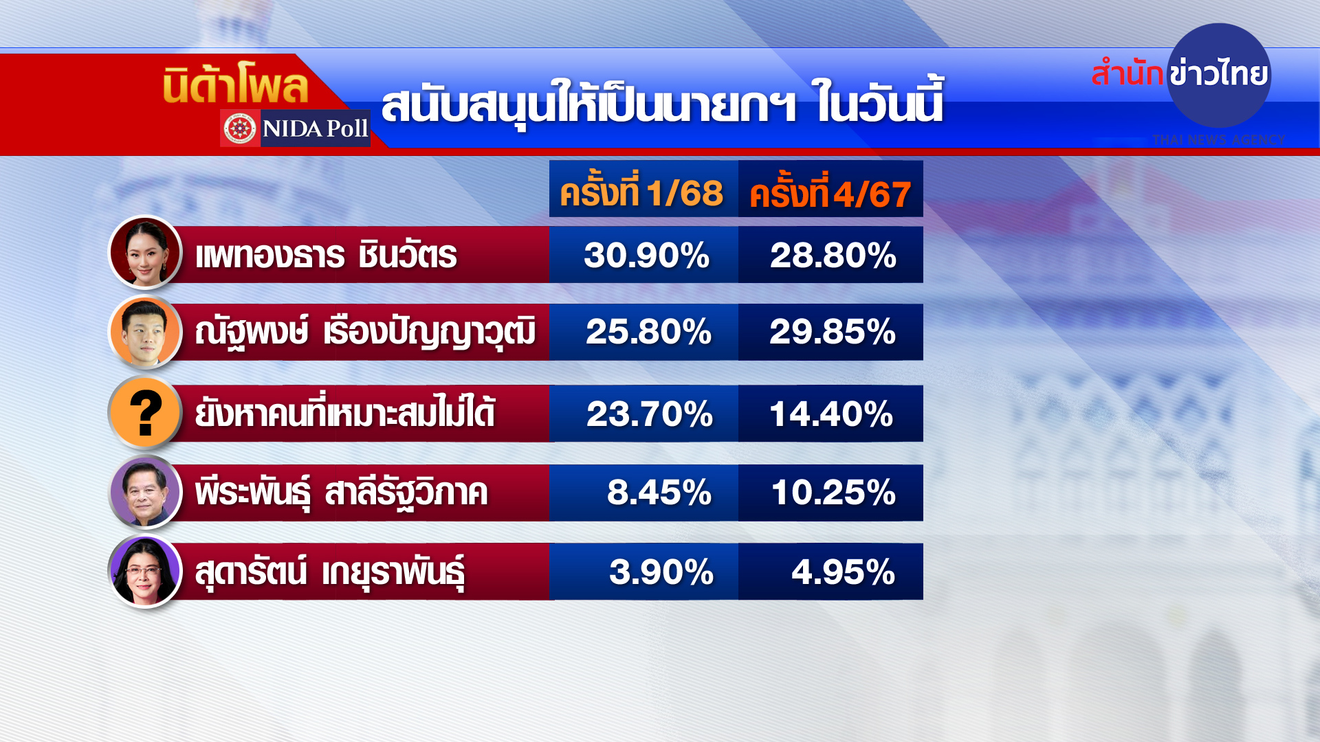 จากการสำรวจเมื่อถามถึงบุคคลที่ประชาชนจะสนับสนุนให้เป็นนายกรัฐมนตรีในวันนี้ พบว่า อันดับ 1 ร้อยละ 30.90 ระบุว่าเป็น น.ส.แพทองธาร (อุ๊งอิ๊ง) ชินวัตร (พรรคเพื่อไทย) เพราะชื่นชอบการทำงานและนโยบายของพรรคเพื่อไทย พร้อมทั้งอยากให้โอกาสบริหารต่อไปเพื่อพิสูจน์ผลงาน อันดับ 2 ร้อยละ 25.80 ระบุว่าเป็น นายณัฐพงษ์ (เท้ง) เรืองปัญญาวุฒิ (พรรคประชาชน) เพราะประชาชนต้องการเห็นคนรุ่นใหม่เข้ามาบริหารประเทศที่มีแนวคิดใหม่ ซื่อตรง โปร่งใส และมีนโยบายที่เข้าถึงประชาชนได้จริง อันดับ 3 ร้อยละ 23.70 ระบุว่า ยังหาคนที่เหมาะสมไม่ได้ อันดับ 4 ร้อยละ 8.45 ระบุว่าเป็น นายพีระพันธุ์ สาลีรัฐวิภาค (พรรครวมไทยสร้างชาติ) เพราะเป็นบุคคลที่มีความรู้ ความสามารถ ซื่อสัตย์ ยุติธรรม และมีนโยบายที่ชัดเจน อันดับ 5 ร้อยละ 3.90 ระบุว่าเป็น คุณหญิงสุดารัตน์ เกยุราพันธุ์ (พรรคไทยสร้างไทย) เพราะมีประสบการณ์ การบริหาร นโยบายซื่อตรงและอุดมการณ์หนักแน่น