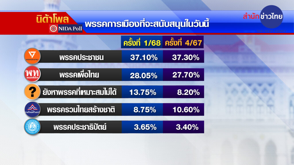 ท้ายที่สุดเมื่อถามถึงพรรคการเมืองที่ประชาชนจะสนับสนุนในวันนี้ พบว่า อันดับ 1 ร้อยละ 37.10 ระบุว่าเป็นพรรคประชาชน อันดับ 2 ร้อยละ 28.05 ระบุว่าเป็น พรรคเพื่อไทย อันดับ 3 ร้อยละ 13.75 ระบุว่า ยังหาพรรคการเมืองที่เหมาะสมไม่ได้ อันดับ 4 ร้อยละ 8.75 ระบุว่า พรรครวมไทยสร้างชาติ อันดับ 5 ร้อยละ 3.65 ระบุว่าเป็น พรรคประชาธิปัตย์ .-สำนักข่าวไทย