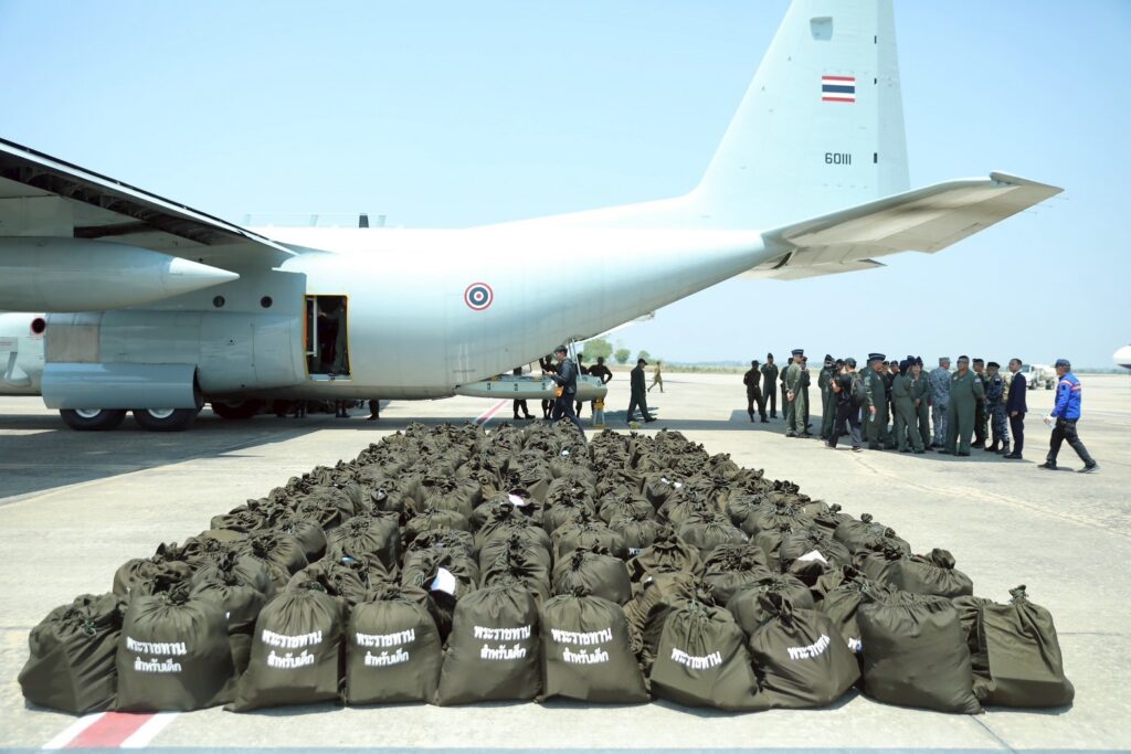 เมียนมา 1 เม.ย.- ทัพฟ้านำ C-130 ส่งมอบสิ่งของพระราชทานช่วยเหลือผู้ประสบภัยพิบัติในเหตุการณ์แผ่นดินไหวที่สาธารณรัฐแห่งสหภาพเมียนมา