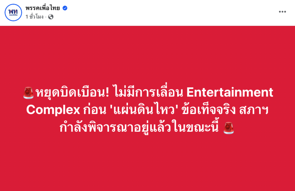 ผู้สื่อข่าวรายงานว่าเพจเฟซบุ๊ก พรรคเพื่อไทย ได้โพสต์ข้อความระบุว่า “หยุดบิดเบือน! ไม่มีการเลื่อน Entertainment Complex ก่อน ‘แผ่นดินไหว’ ข้อเท็จจริง สภาฯ กำลังพิจารณาอยู่แล้วในขณะนี้”