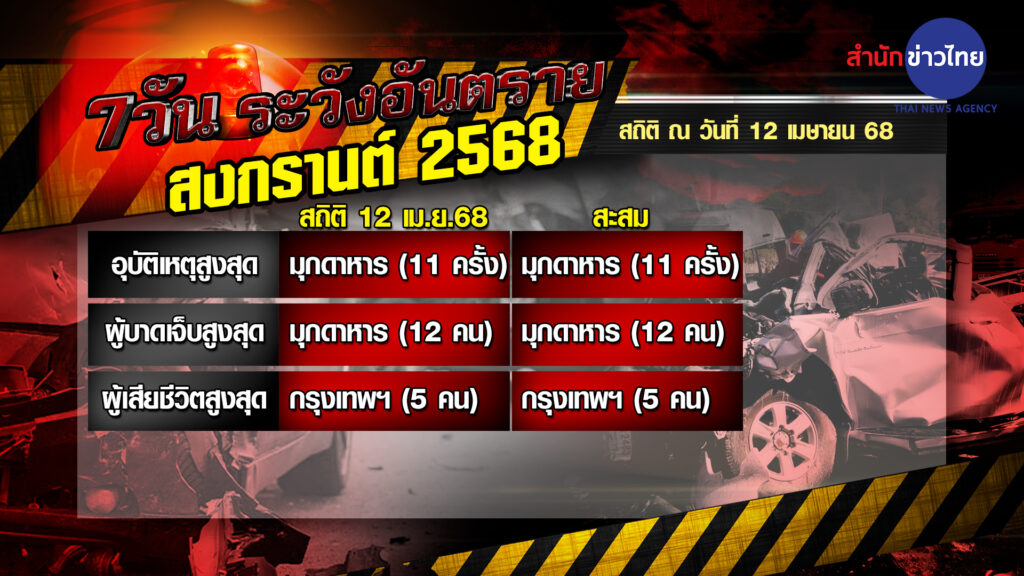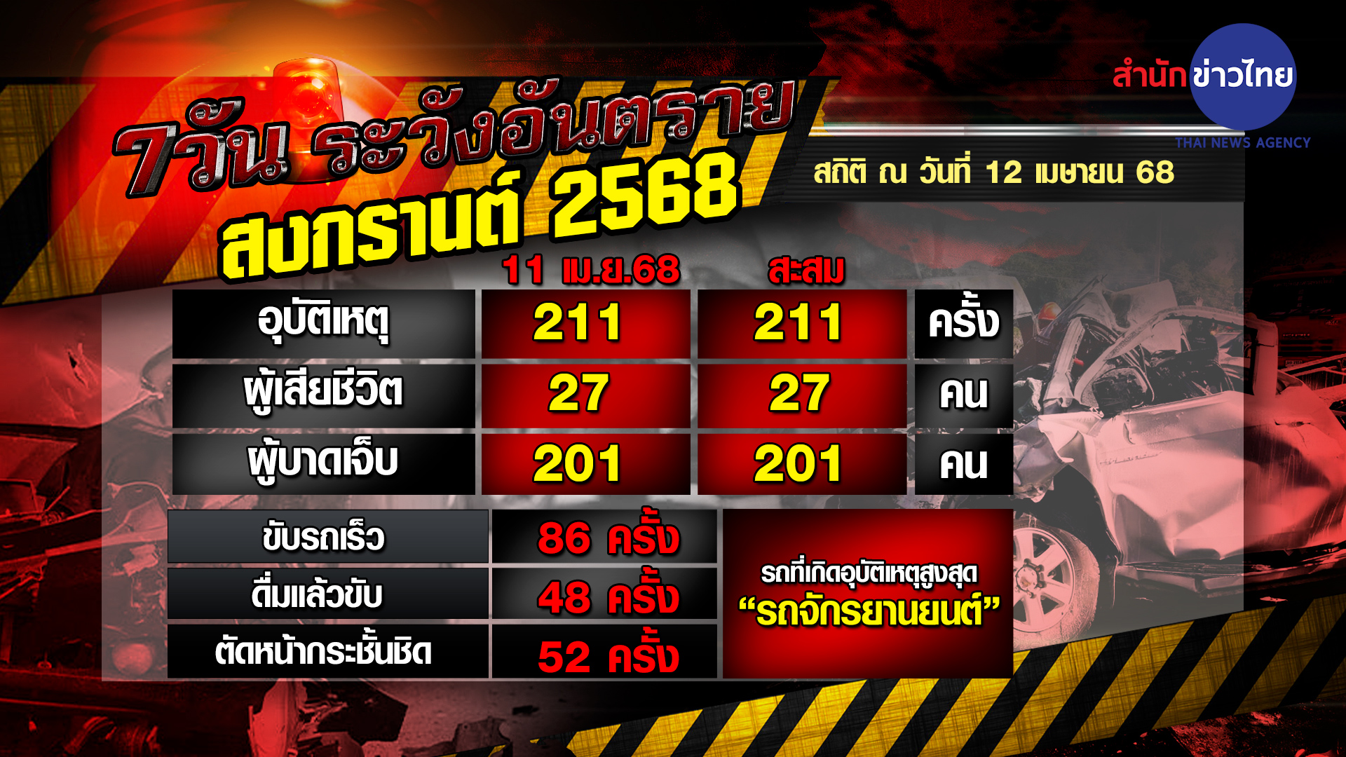 กรุงเทพฯ 12 เม.ย. – ศปถ. แถลง 7 วันอันตรายช่วงสงกรานต์ เกิดอุบัติเหตุ 211 ครั้ง บาดเจ็บ 201 คน เสียชีวิต 27 ราย กทม. แชมป์ 5 ศพ สาเหตุขับรถเร็ว พร้อมกำชับช่วงวันเฉลิมฉลอง ส่งตำรวจพื้นที่จัดงาน-ปั๊มน้ำมัน สังเกตพบพฤติกรรมเมาจับตรวจแอลกอฮอล์และให้พักทันที