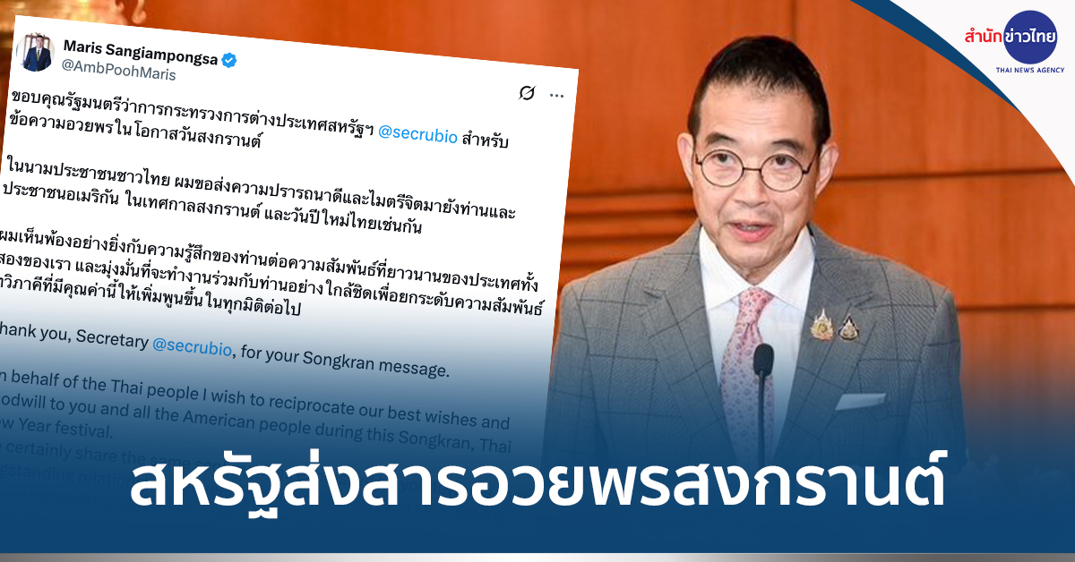 13 เม.ย.- สหรัฐส่งสารอวยพรสงกรานต์ปีใหม่ไทย ซาบซึ้งมิตรภาพอันยาวนาน หวังได้บุกเบิกความร่วมมือใหม่ ด้าน “มาริษ” ขอบคุณ พร้อมมุ่งมั่นทำงานร่วมกันต่อไป