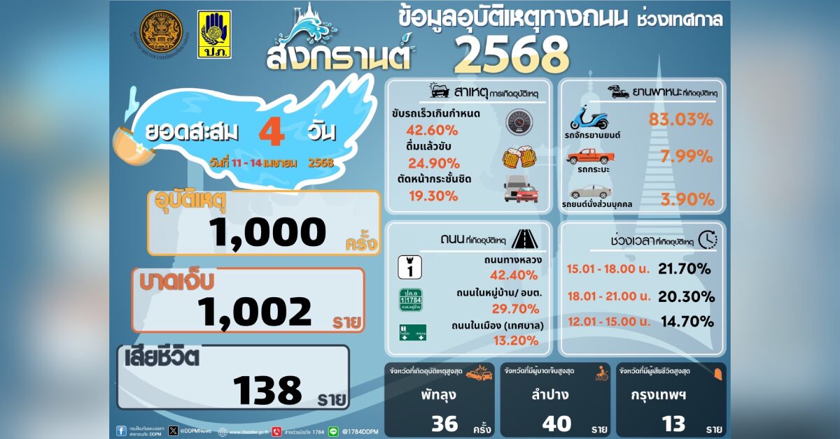 สรุปอุบัติเหตุทางถนนสะสมในช่วง 4 วันของการรณรงค์ (11 เมษายน – 14 เมษายน 2568) เกิดอุบัติเหตุรวม 1,000 ครั้ง ผู้บาดเจ็บรวม 1,002 คน ผู้เสียชีวิต รวม 138 ราย จังหวัดที่ไม่มีผู้เสียชีวิต (ตายเป็นศูนย์) มี 24 จังหวัด จังหวัดที่เกิดอุบัติเหตุสะสมสูงสุด ได้แก่ พัทลุง 36 ครั้ง จังหวัดที่มีผู้บาดเจ็บสะสมสูงสุด ได้แก่ ลำปาง 40 คน จังหวัดที่มีผู้เสียชีวิตสะสมสูงสุด ได้แก่ กรุงเทพมหานคร 13 ราย.-316-สำนักข่าวไทย