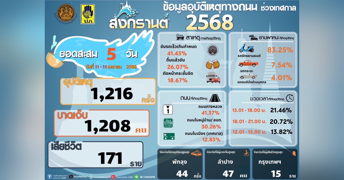 ส่วนยอดสะสม 5 วัน (11-15 เมษายน) เกิดอุบัติเหตุ 1,216 ครั้ง ผู้บาดเจ็บ 1,208 คน ผู้เสียชีวิต 171 ราย