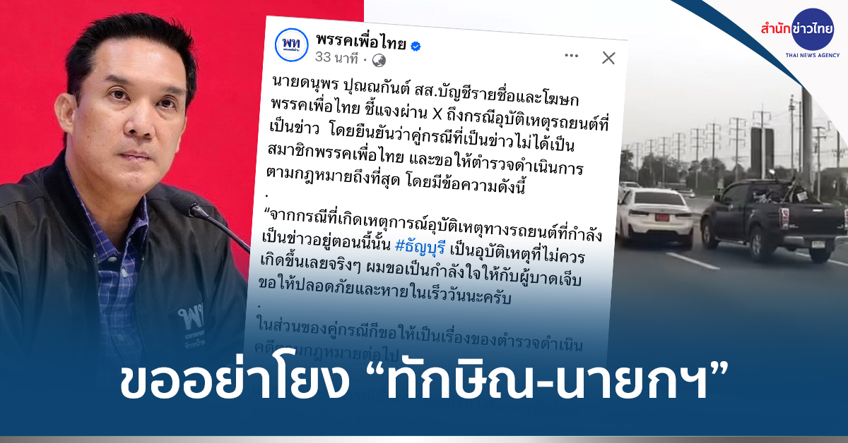 “นอกจากนั้น ในกรณีที่มีการโยงถึงทางพรรคเพื่อไทย ต้องเรียนแจ้งว่า คู่กรณีคนดังกล่าวเป็นนักการเมืองท้องถิ่น ไม่ได้เป็นสมาชิกพรรคเพื่อไทย ไม่มีส่วนเกี่ยวข้องกับพรรคเพื่อไทยแต่อย่างใด ขอทุกท่านอย่านำเรื่องดังกล่าวมาโยงกับการเมือง หรือ ท่านอดีตนายกฯ ทักษิณ และนายกฯ แพทองธาร พวกเรามาร่วมเป็นกำลังใจให้กับผู้บาดเจ็บดีกว่าครับ” .-316 – สำนักข่าวไทย