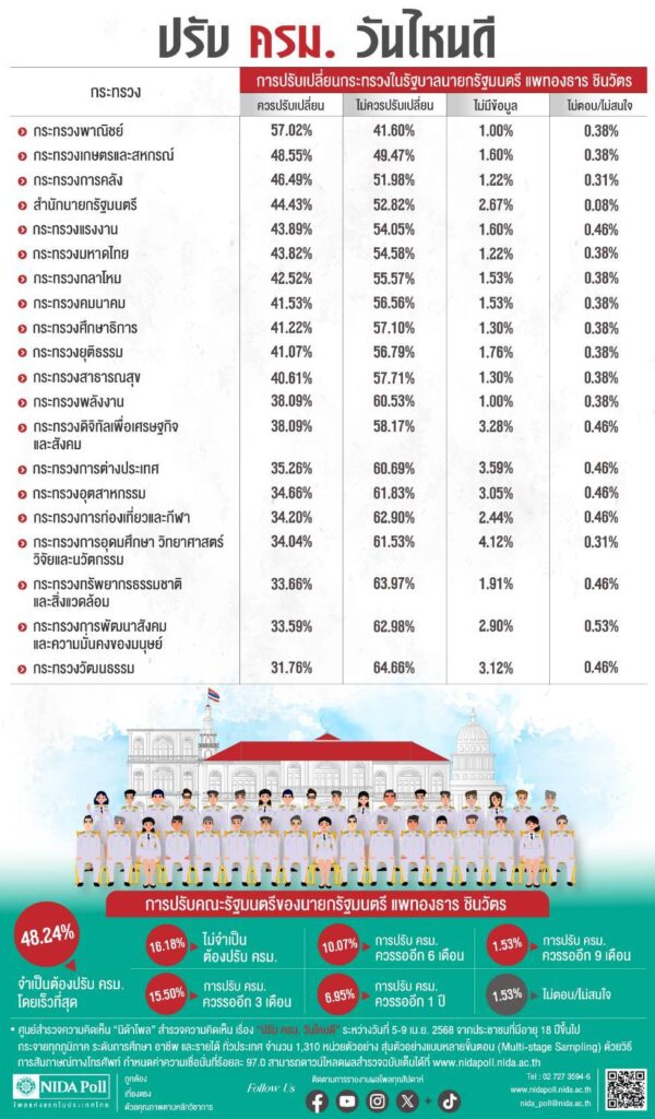 จากการสำรวจเมื่อถามถึงการปรับเปลี่ยนกระทรวงในรัฐบาลนายกรัฐมนตรี แพทองธาร ชินวัตร พบว่า
