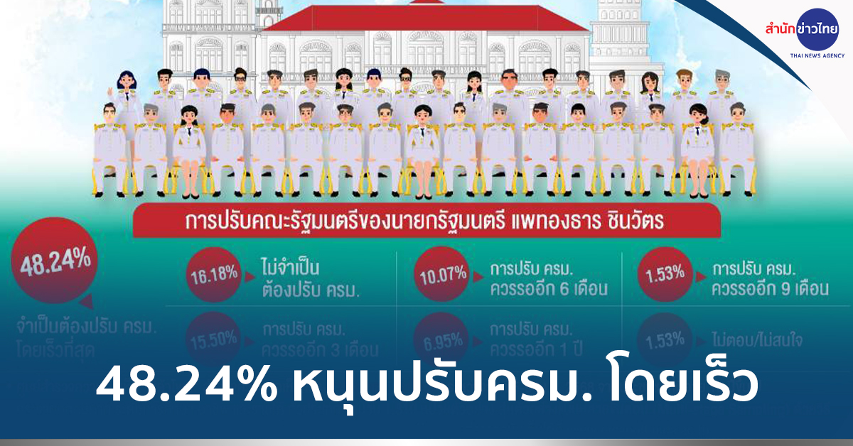 ท้ายที่สุดเมื่อถามถึงการปรับคณะรัฐมนตรีของนายกรัฐมนตรี แพทองธาร ชินวัตร พบว่า ตัวอย่าง ร้อยละ 48.24 ระบุว่า จำเป็นต้องปรับ ครม. โดยเร็วที่สุด รองลงมา ร้อยละ 16.18 ระบุว่า ไม่จำเป็นต้องปรับ ครม. ร้อยละ 15.50 ระบุว่า การปรับ ครม. ควรรออีก 3 เดือน ร้อยละ 10.07 ระบุว่า การปรับ ครม. ควรรออีก 6 เดือน ร้อยละ 6.95 ระบุว่า การปรับ ครม. ควรรออีก 1 ปี และร้อยละ 1.53 การปรับ ครม. ควรรออีก 9 เดือน และไม่ตอบ/ไม่สนใจ ในสัดส่วนที่เท่ากัน