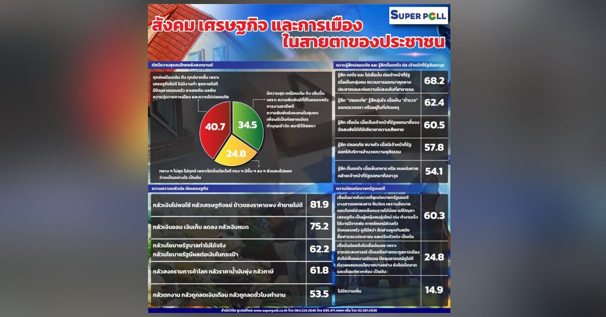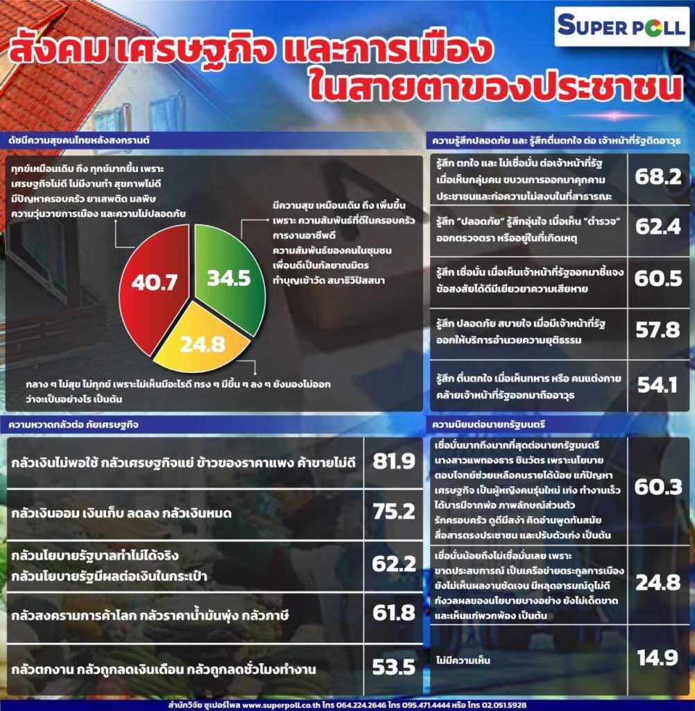 20 เม.ย. – ซูเปอร์โพล เผยคนไทย 40.7% กลับมาทุกข์หลังสงกรานต์ วิตกเศรษฐกิจ-การเมือง ชี้ ‘แพทองธาร’ ยังครองใจประชาชน 60.3% เหตุภาพลักษณ์ผู้นำรุ่นใหม่ นโยบายช่วยคนจนโดนใจ