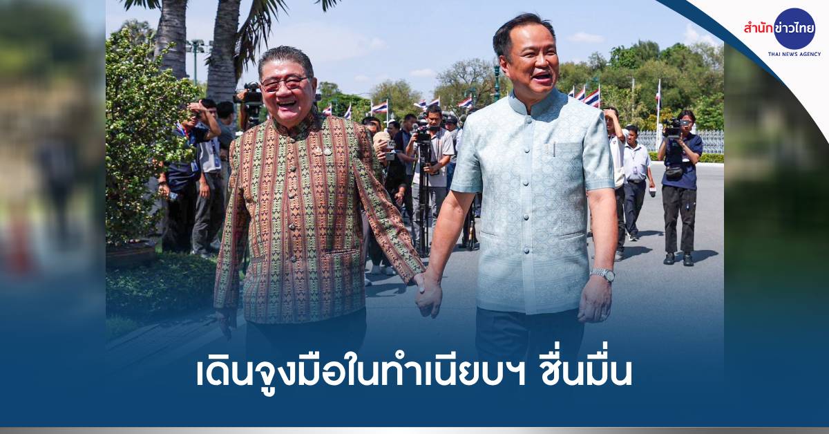 ทำเนียบ 22 เม.ย.-“ภูมิธรรม” เดินจูงมือ “อนุทิน” ในทำเนียบฯ ชื่นมื่น สยบปัญหาขัดแย้งพรรคร่วม ด้าน “เสี่ยหนู” หยอก ไม่เชื่อคงต้องหอมแก้มให้ดู