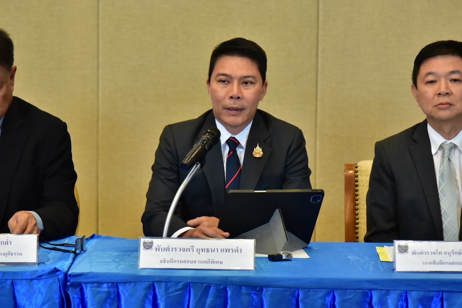 นายสมบูรณ์ ม่วงกล่ำ ที่ปรึกษารัฐมนตรีว่าการกระทรวงยุติธรรม พร้อมด้วยพ.ต.ต.ยุทธนา แพรดำ อธิบดีกรมสอบสวนคดีพิเศษ (ดีเอสไอ พ.ต.ท.อนุรักษ์ โรจนนิรันดร์กิจ รออธิบดีดีเอสไอ พ.ต.ต.วรณัน ศรีล้ำ ผู้อำนวยการกองคดีคุ้มครองผู้บริโภค และโฆษกดีเอสไอ และ พ.ต.ต.ณฐพล ดิษยธรรม ผู้เชี่ยวชาญเฉพาะด้านคดีคุ้มครองผู้บริโภคและสิ่งแวดล้อมร่วมแถลงกรณีดีเอสไอรับคดีอั้งยี่ฮั้งเลือก สว.เป็นคดีพิเศษ